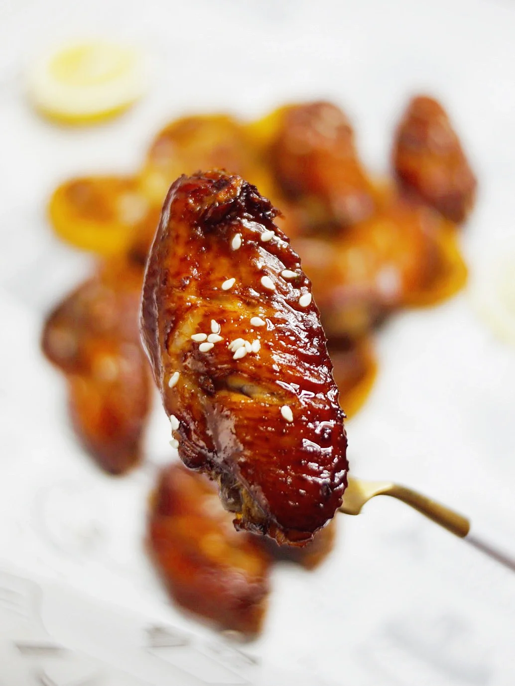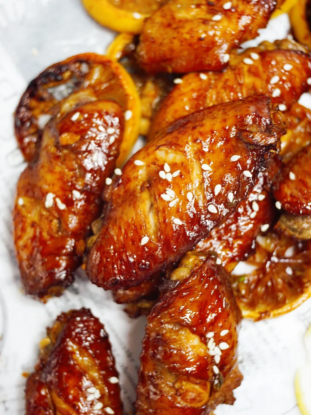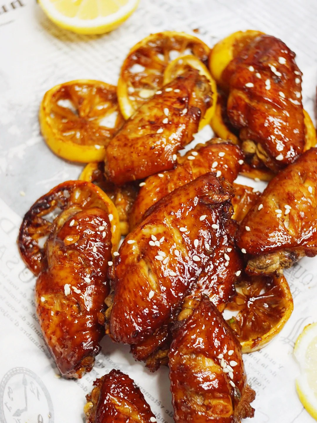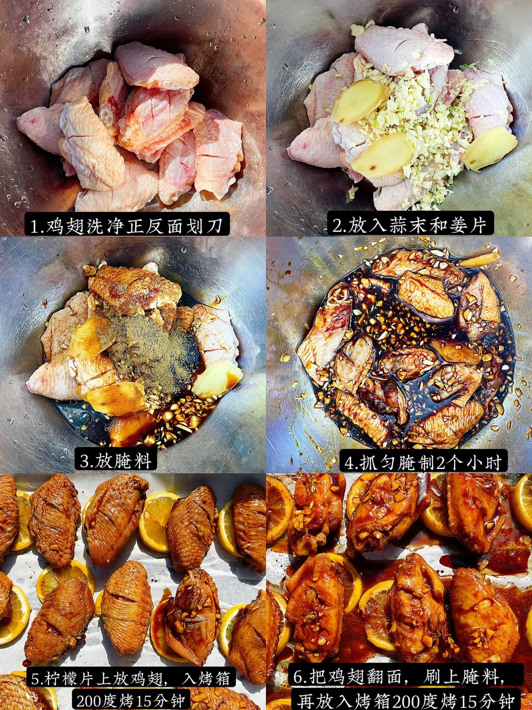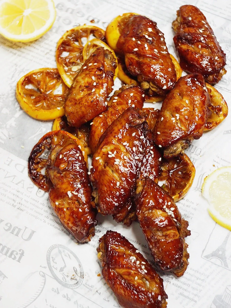 3️⃣烤盘上放柠檬片打底,放鸡翅,入烤箱200度15分钟,把鸡翅翻面,再刷上一层腌料,入烤箱200度继续烤10分钟🕰
