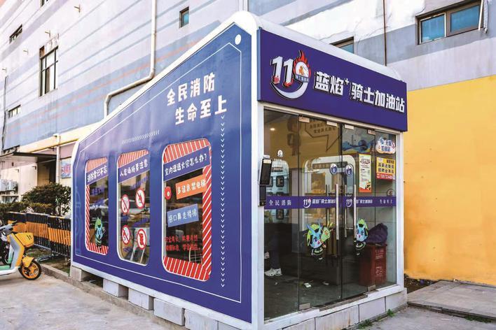 该驿站结合“119”消防宣传月主题“全民消防、生命至上——安全用火用电”,依托城市主流商圈原有骑士加油站进行功能升级,在保留休息、充电、饮水等基础服务的同时,深度融入消防元素。