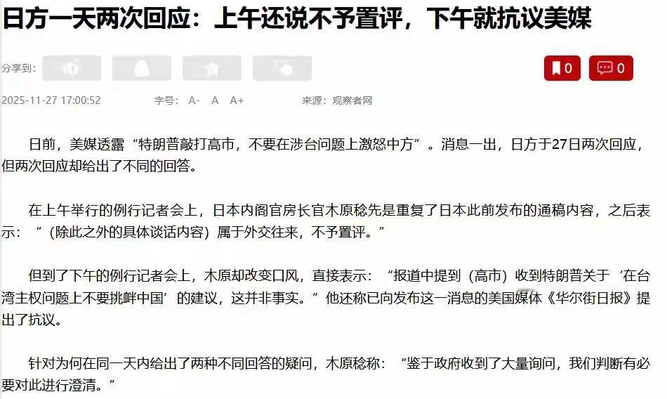 特朗普25日的电话终究没能按住东京的躁动。当《华尔街日报》曝出特朗普训诫日本极右翼政客要收敛锋芒的消息后,日本内阁官房长官木原稔竟在11月27日公然向该媒提出抗议——这记回马枪不仅戳破了美日主从关系的表象,更暴露了高市早苗政权正把整个国运押上赌桌的疯狂。 日本这次的反应堪称“下克上”的现代演绎。要知道这个二战后被美国牢牢掌控的国家,历来对白宫指令唯命是从。但此刻他们竟敢对着华尔街日报的报道跳脚,本质是在扇特朗普耳光。更讽刺的是,日本此前在美国大选中押错宝,还是靠着安倍遗孀携千亿美金赴美才勉强修复关系。如今却趁着中美博弈的间隙,妄图通过碰瓷台湾问题来激活国内民粹,甚至做着拥核自重的美梦。 霓虹灯下的赌徒心态昭然若揭:他们盘算着美国对华围剿时的力不从心,惦记着甲午海战的陈年旧账,却选择性遗忘广岛长崎的蘑菇云。当高市早苗们叫嚣“台湾有事即日本有事”时,不过是在重复1930年代军国主义的危险试探。但今日中国早已不是吴下阿蒙,75年磨砺的利剑正待出鞘。这场东亚危局既是挑战也是契机——若日本执意要当新世纪的战争定义者,必将亲身体验何为真正的降维打击。
