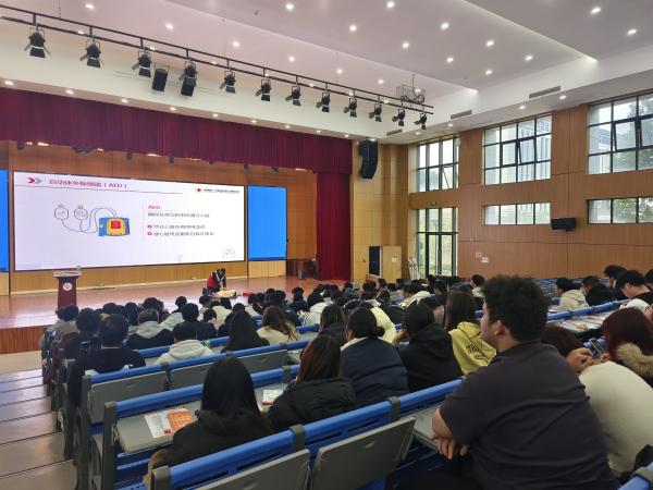 紧接着,宁国市红十字会赈济救护部长钟甜通过现场宣讲、发放宣传手册等方式,向师生普及无偿献血、造血干细胞捐献知识,并结合真实案例,生动诠释了无偿献血与造血干细胞捐献对挽救生命的重要意义,引导青年学子树立“献血传递希望,携手挽救生命”的公益理念,鼓励大家成为应急救护知识的传播者和“三献”事业的参与者。
