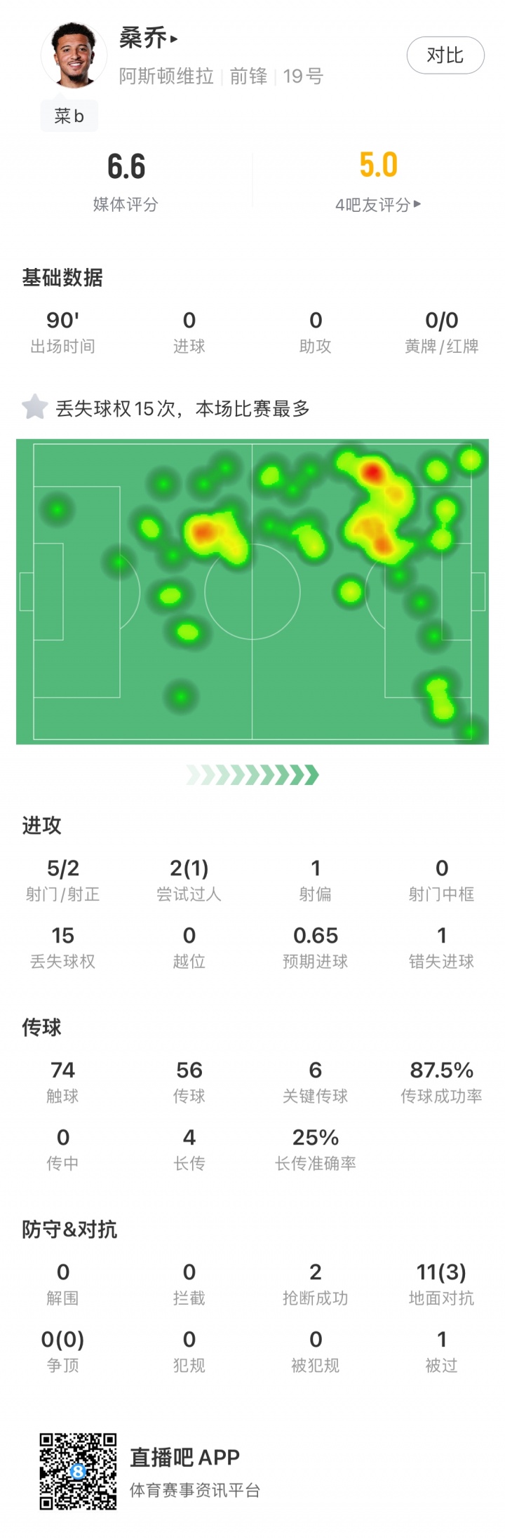 桑乔此役首发打满全场,5射2正,贡献6次关键传球,1次错失进球。