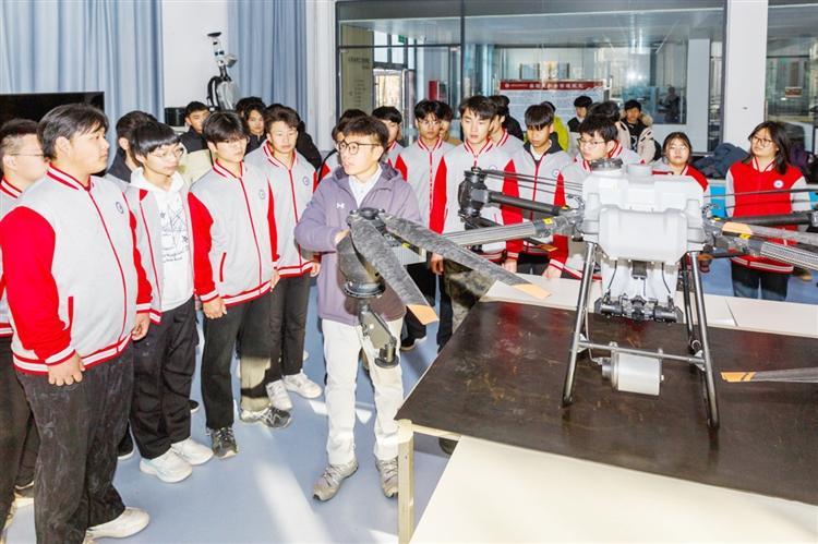 图为11月26日,山东水利技师学院水利工程系无人机实训中心,教师正在为学生们讲解无人机的构造与飞行原理。