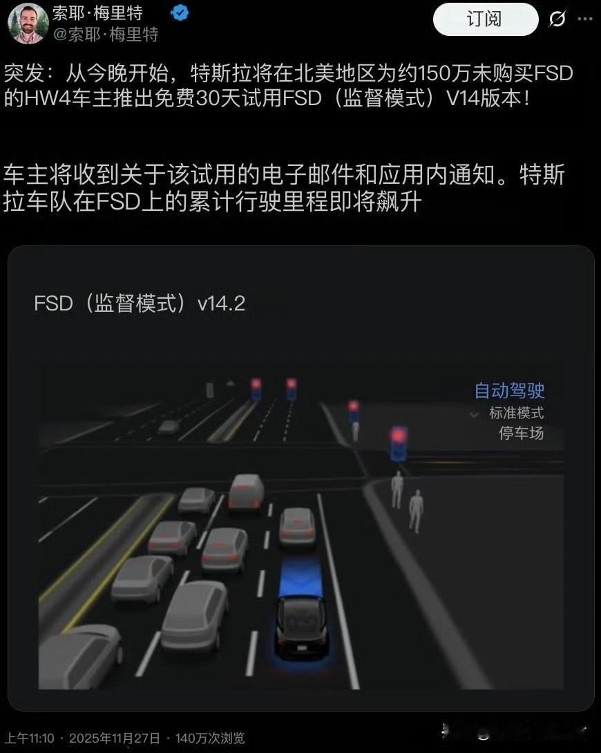 特斯拉的数据飞轮要转的更快了。 宣布要给北美150万未订阅FSD的HW4车主推送
