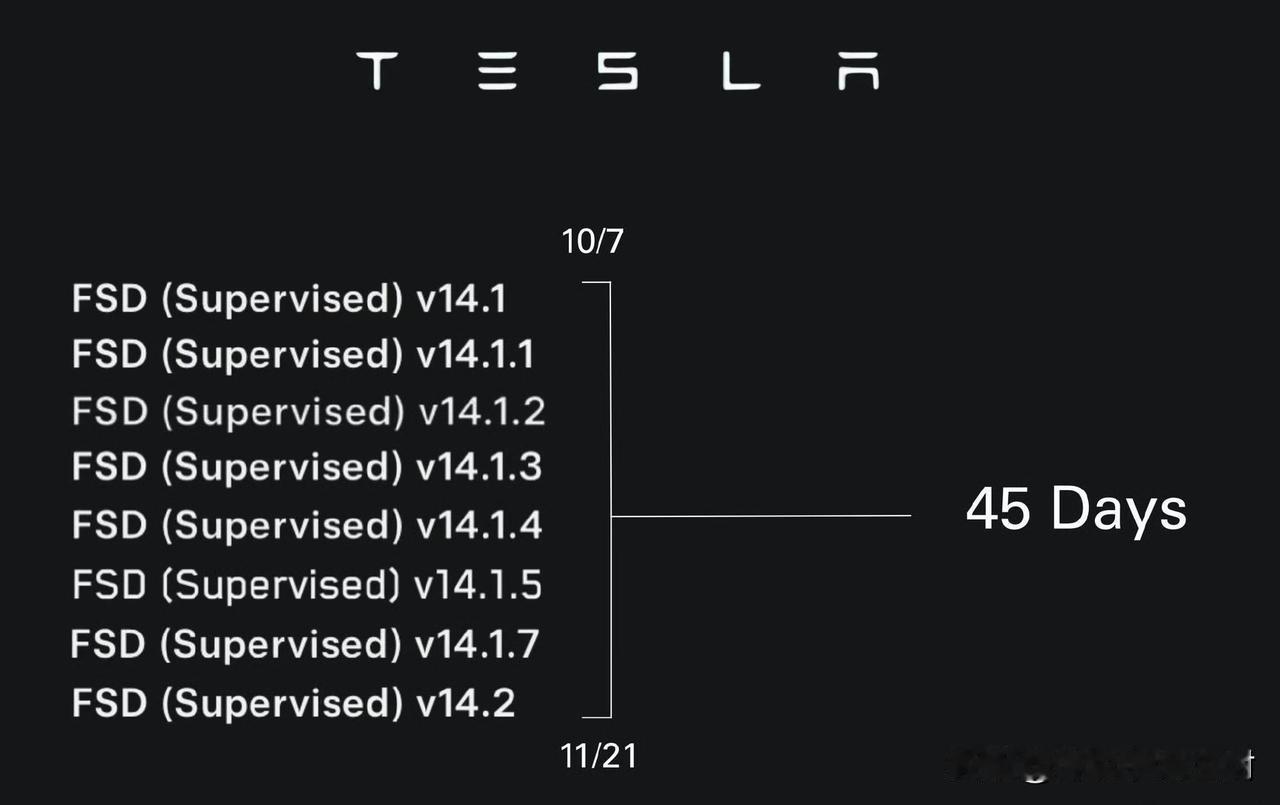 特斯拉的数据飞轮要转的更快了。 宣布要给北美150万未订阅FSD的HW4车主推送30天免费试用FSD,还是最新的V14.2版本。 特斯拉的燃料(数据)要飙升了…… 再看看最近一段时间特斯拉的FSD更新的频率有多快(图二),45天8个版本,这曾经是我们才有的速度,可现在却反了过来,跑在前面的FSD反而越来越快,按照马斯克之前的暗示,V14.3版本k可能就是首个公开无监督版FSD了。 而国内还在争论VLA、VLM、世界模型、强化学习等名词的内涵到底是什么,请问什么时候才能做出低时延、无安全接管的智驾?