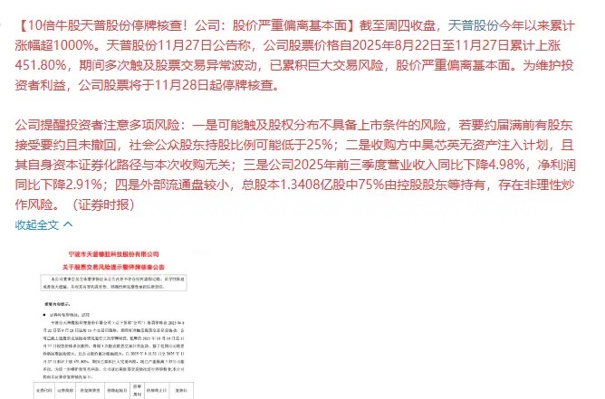 10倍大牛股天普股份停牌!昨天品茗科技预停牌,直接大跌12CM!天普股份昨天第二波3连板涨停被砸,晚上停牌核查。最近停牌,预停牌,不仅针对高标连板,现在高标趋势也纳入强JG兑现。品茗科技,天普股份都是趋势二波大涨。值得注意的是之前停牌,预停牌都针对的是涨停股,当日涨停股,现在当日下跌,上涨,次日都可能停牌。品茗科技昨天的预停牌,对高标连板,涨停股打击巨大,昨天连板指数全A跌幅榜第一,高标股,涨停股亏钱效应,空间板压缩至4板。今天10倍股天普股份停牌,雪上加霜,另一个20倍股上纬新材也要小心点。