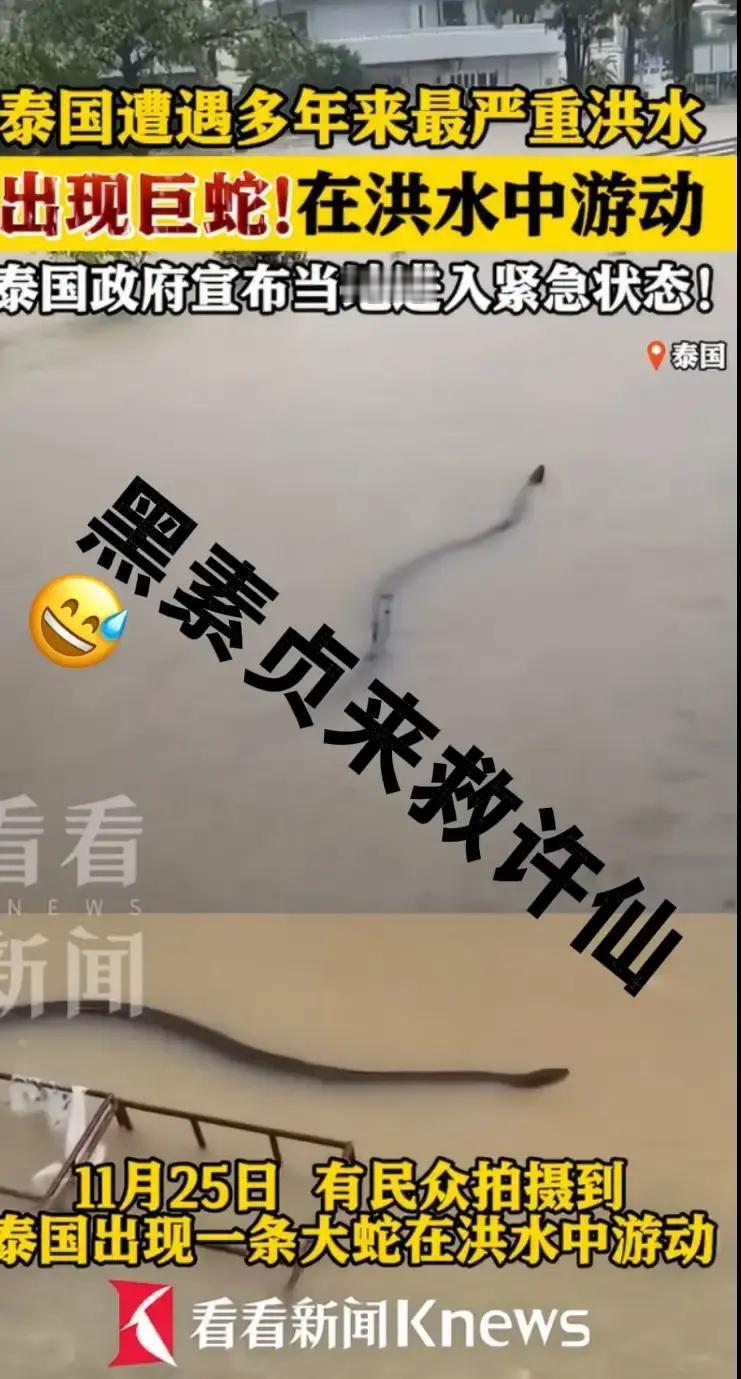 万万没想到 泰国当地时间11月25日,当地民众都拍到巨蛇在洪水里游,画面那叫一个震撼,泰国政府宣布宋卡府进入紧急状态。这是不是许仙被法海骗到泰国,白素贞来个水漫泰国了,还挺有想象力。不过这场洪灾造成的损失可不小,据官方数据,暴雨已经导致至少13人死亡,近200万人受影响。 不过这巨蛇的事儿,我蹲了好几天后续都没见官方回应。有人说那是成年网纹蟒,泰国南部本就多这类大蛇,但在洪水里这么招摇游还是头回见;也有人说拍摄角度放大了效果,实际没那么夸张。但不管真假,这视频确实把洪灾关注度拉满了,很多人之前都没意识到泰国这场雨下得有多凶。 刷到当地居民发的实拍:宋卡府主干道积水到胸口,私家车泡水里只露车顶,超市饮用水泡面被抢空,老人孩子被困在家没吃的。紧急状态启动后,政府派了冲锋舟,可偏远村子路冲断了,物资根本送不进去。近200万人受影响,换算下来每30个泰国人里就有一个遭殃——要么房子淹了,要么没法上班,要么家人失联。 其实泰国每年9-12月是雨季,但今年降雨强度比往年高三成。气象专家说和厄尔尼诺导致的极端天气有关,加上部分城市排水系统老化,雨水排不出去才酿成大灾。这事儿敲了警钟:气候变化不是空话,它真会变成实打实的灾难,每个国家都得提前准备。 网友调侃白素贞虽是玩笑,却透着无奈。面对天灾普通人除了祈祷好像做不了啥,但比起讨论巨蛇真假,更该关注受灾群众现状——他们要的不是猎奇目光,是干净水、热饭,是早日回归正常生活。 希望泰国雨早点停,救援能覆盖每个角落,受灾家庭早日重建家园。天灾无国界,大家平安才好。水淹泰国 泰国洪水