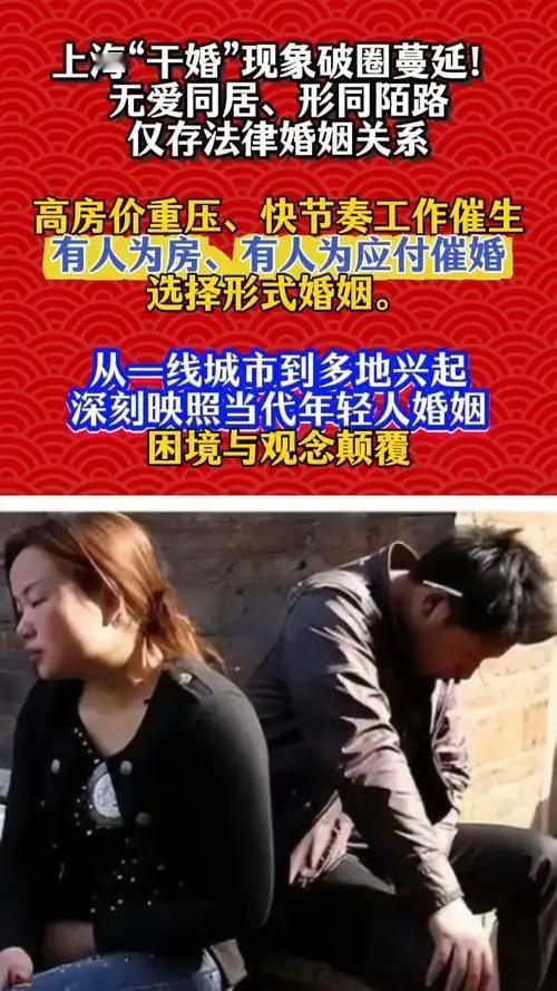 “干婚”来袭,婚姻困局何解? 最近,“干婚”成了网络热词,正从上海悄然席卷全国。啥是“干婚”?简单说,就是夫妻法律上还是两口子,可情感、经济、生活却像合租室友,各过各的。 上海作为“干婚”的“发源地”,约15%的夫妻主动或被动陷入这种模式,北京、广州、深圳等一线城市,还有部分二三线城市,比例也在蹭蹭往上涨。为啥会这样?高强度工作是“罪魁祸首”,996成了家常便饭,通勤又像一场漫长的马拉松,夫妻俩累得只想倒头就睡,哪有时间谈情说爱。再加上经济压力山大,房价高得离谱,离婚就意味着居住成本飙升,还有孩子抚养、社会舆论这些“紧箍咒”,让夫妻不敢轻易说分手。 可“干婚”这碗苦水,长期喝下去,夫妻心理健康受影响,抑郁指数比普通已婚人群高出35%,孩子成长也受牵连。婚姻本应是温馨的港湾,可别让“干婚”变成冰冷的枷锁啊!
