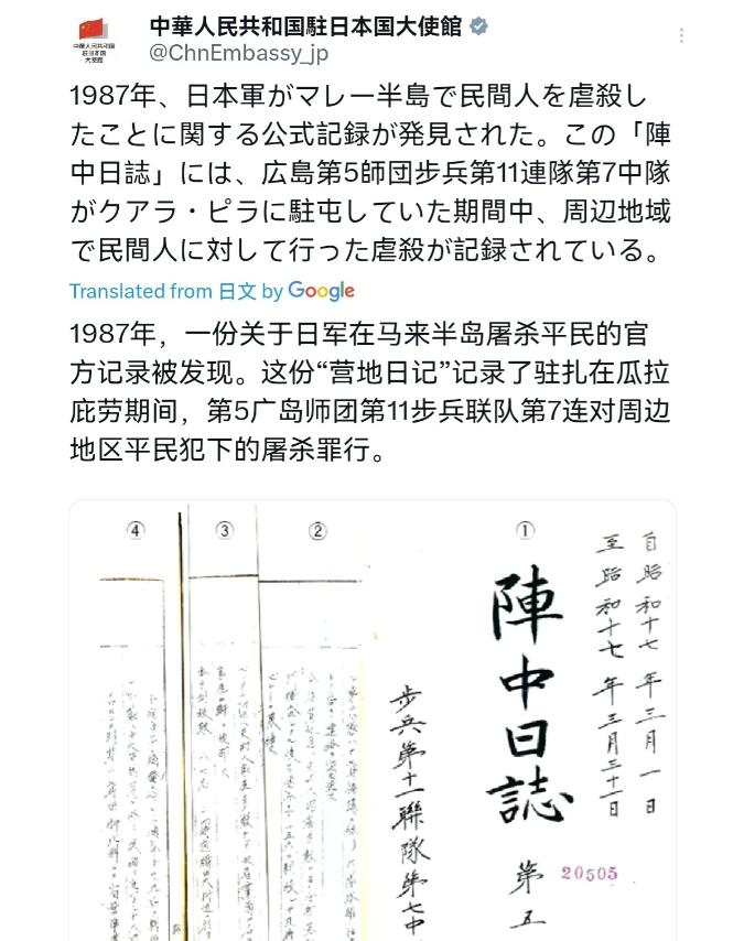 中国驻日大使馆继续回敬!就看黄循财自己尴不尴尬!11月27日,中国驻日大使馆刊出日文文件写到,1987年,日本军队在马来半岛屠杀平民的官方记录被发现。这份《阵中日志》记载了广岛第5师团步兵第11联队第7中队驻守瓜拉庇劳(Kuala Pilah)期间,在周边地区对平民实施的屠杀行为。   中国驻日大使馆这招“旧事重提”,精准戳中了某些人的痛处。那份《阵中日志》,可不是泛黄的故纸堆,而是广岛第5师团步兵第11联队第7中队在马来半岛瓜拉庇劳的杀人账本。本子里写着“铁路线及道路两侧500米外中国人及英国人,无论老幼妇孺,务必彻底扫荡”,后面跟着“刺死不贞分子156名”。啥叫“不贞分子”?就是看你不顺眼的平民。   日本人对马来半岛的屠杀,从一开始就带着明确的种族清洗目的。他们恨华侨,因为抗战时南洋华人捐钱捐物,陈嘉庚的南侨机工队直接开上滇缅公路。新加坡沦陷后,山下奉文搞“肃清行动”,甄别标准荒唐到看面相、戴眼镜都算罪名。   宪兵曹长中山三男战后说“要干掉一半华侨,稍微可疑的就处理”,结果日方统计5000人死亡,新马华人认为超过5万。这种“官方记录”和民间记忆的巨大鸿沟,恰恰暴露了日本系统性掩盖罪行的企图。   更值得玩味的是战后审判,英国在吉隆坡、槟城等地搞军事法庭,抓了几百个战犯,可最后呢?主导槟城大检举的宪兵队长东川好信,1946年被判死刑,1951年就被悄悄放回日本。为啥?冷战开始了,英国要拉拢日本对抗苏联,战犯成了弃子。   马来西亚独立后,官方叙事里这段历史被淡化,吉隆坡审判旧址现在是旅游景点,没人提当年的枪声。   现在中国大使馆翻出这本《阵中日志》,等于把钉在历史耻辱柱上的钉子又敲了敲。黄循财们的尴尬,在于东南亚国家的历史记忆被刻意模糊了太久。马来西亚华人至今管日军叫“蝗军”,因为他们真的像蝗虫一样吃光了百姓的粮食,烧光了村庄。   可官方教科书里,这段历史被简化成“日据时期”,重点放在“激发民族觉醒”上,抗日军的牺牲很少提。新加坡的死难者纪念碑下埋着万人遗骨,但每年公祭时,总有人忌讳提“日军屠杀”四个字。   日本现在的小动作更恶心,去年他们把“侵略”改成“进入”,今年又有人提议删除教科书里的“随军慰安妇”。驻日使馆选在这个时候公布马来半岛的屠杀记录,就是要撕开所谓“历史终结论”的谎言。   《阵中日志》是日军自己的记录,不是幸存者的回忆,不是战后的控诉,是当时的命令,这就像杀人犯自己写的日记,铁证如山。黄循财们尴尬,因为他们清楚,东南亚的和平不是靠遗忘换来的,而是靠无数平民的血、抗日军的命堆出来的。   最讽刺的是,日本一边否认历史,一边在东南亚搞“经济援助”。槟城的峇都茅要塞,当年是日军虐杀平民的地方,现在成了博物馆,可日本游客来了照样拍照打卡,没人道歉。就像那个被日军砍掉四肢的马来士兵阿南,他的故事在当地家喻户晓,但日本教科书里从来没有。   中国大使馆的“回敬”,不是要翻旧账,而是提醒所有人,当日本政客参拜靖国神社时,他们拜的正是当年在瓜拉庇劳砍杀妇孺的刽子手。   现在的问题不是“要不要原谅”,而是“能不能忘记”。《阵中日志》里的每个数字,都是活生生的人。中国坚持揭露这些,不是为了制造对立,而是不让“蝗军”的历史重演。黄循财们的尴尬,说到底是不敢直面真相的懦弱,毕竟,当有人指着伤疤说“这是蚊子咬的”,最难受的不是伤疤本身,而是说谎的人。