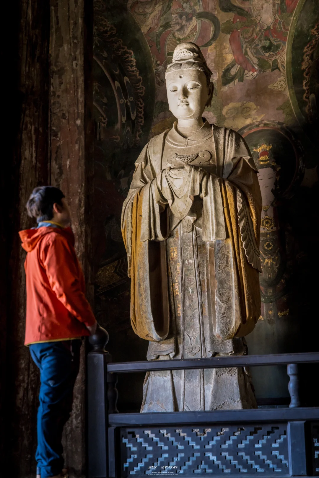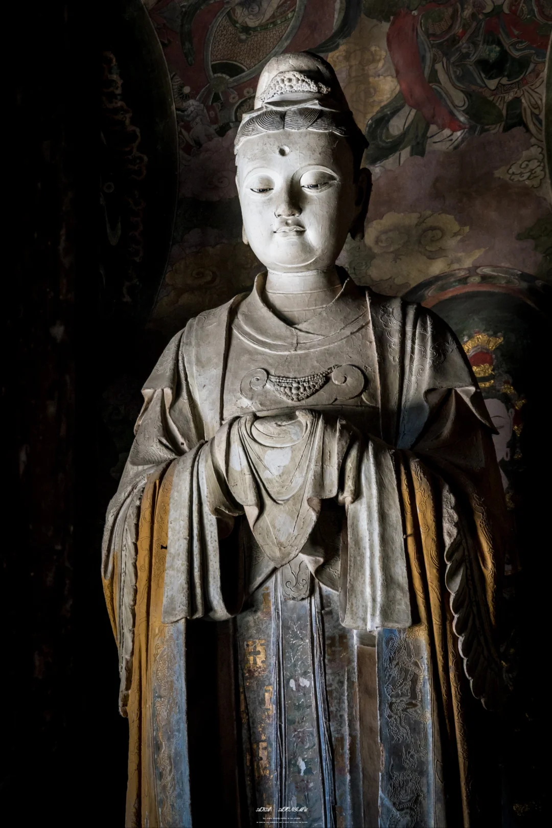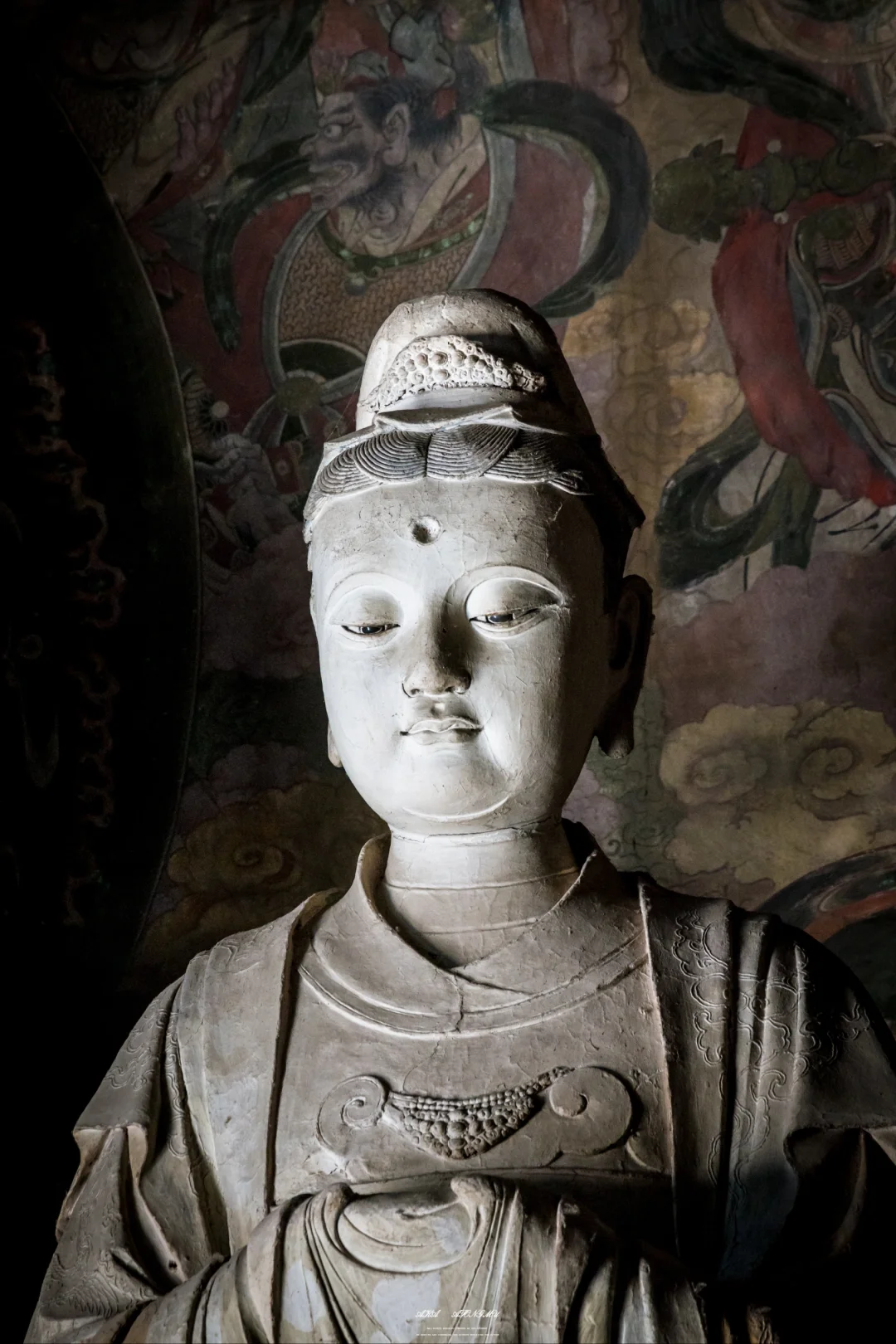 是不是焦虑会时刻伴随在如今每个人心中呢? 以前我囿于办公室的格子间,是为了草料耕耘劳作的牛马 如今虽获得肉体上的自由,却也时常焦虑不确定的明天 直到有一天我来到了善化古寺,站在大吉祥功德天面前,看着她流转千年的慈悲眼眸,这一刻,我觉得答案也没那么重要 这尊塑像高约3.77米,身姿婀娜,比例匀称。她头戴纶巾,发髻布包,布前饰有金花,胸前配有云头如意锁形装饰,双手拢于广袖之中,托举着宝绢。身上穿着羽翼宽袖袍,袖子分为三层,服饰上的星辰、龙凤等纹饰,虽历经岁月洗礼,仍依稀可见当年的华丽。 她面部圆润,弯眉垂目,双目微睁,眼神中充满着悲悯和关怀,仿佛能洞悉人间的一切苦难,又似对众生怀着无尽的慈悲。微微上翘的嘴角,似乎透着一丝笑意,安抚着世人浮躁的心灵。 1933年,梁思成与林徽因考察善化寺时,曾在这尊塑像前驻足良久。林徽因在《晋汾古建筑预查纪略》中写道:“功德天衣袂间的沥粉纹样,竟与《营造法式》所载‘碾玉装’‘贴金箔’之制丝毫不差,其工艺精准度令人咋舌。”梁思成则在写给妻子的信中描述:“当阳光从殿顶气窗斜射入时,功德天袖口的金箔残片忽然亮起来,像星星落在青天上,你定会为这‘凝固的光’惊叹。”