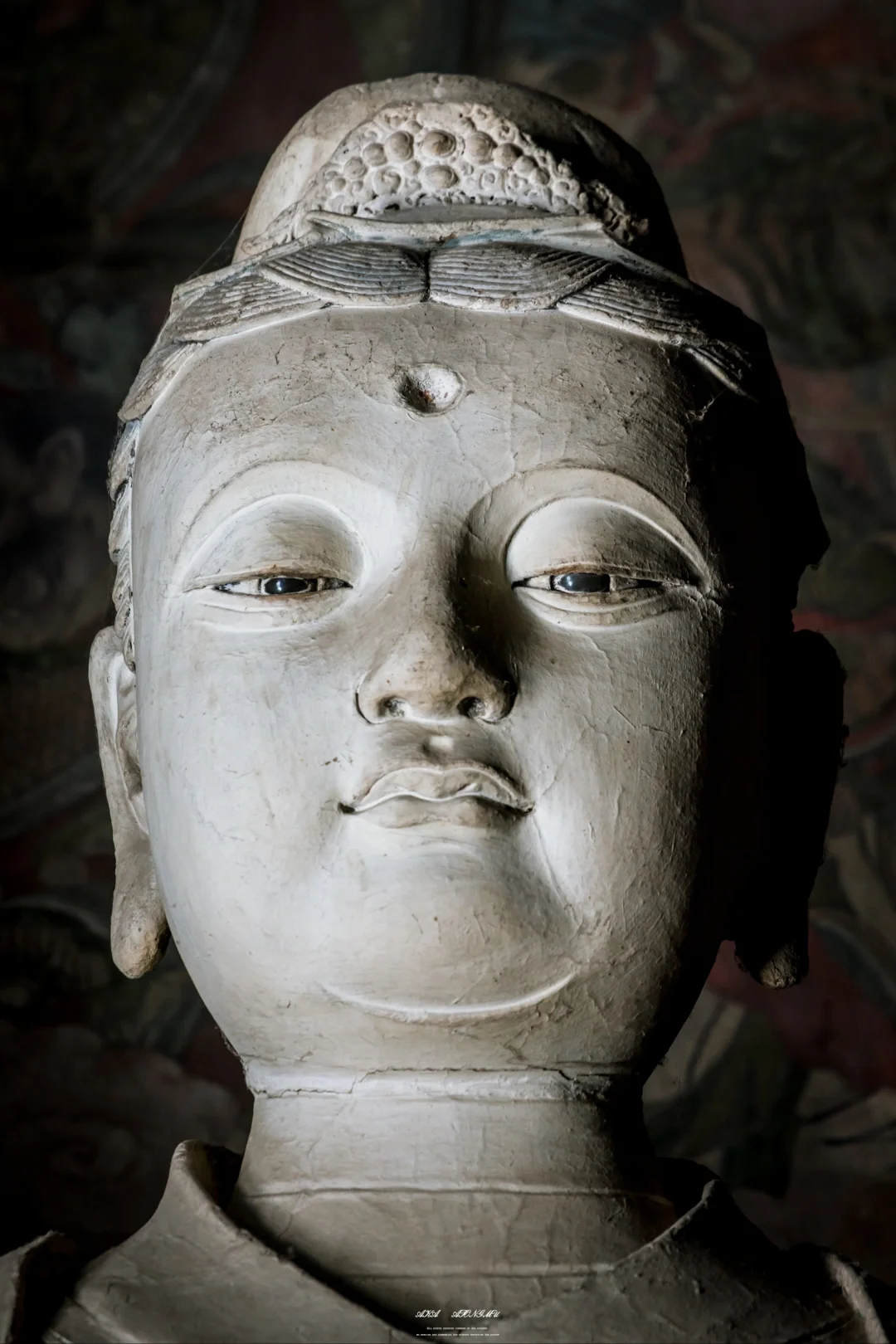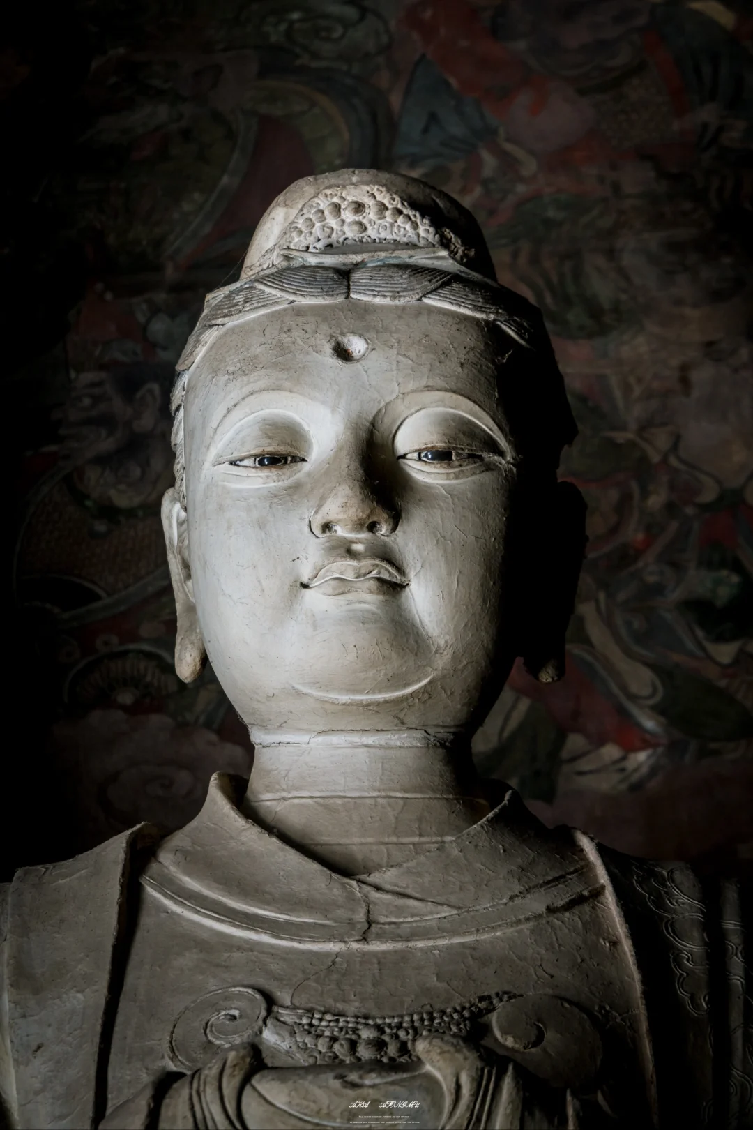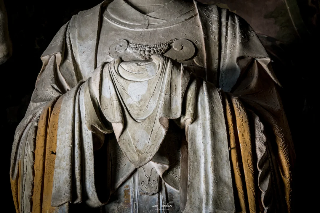 是不是焦虑会时刻伴随在如今每个人心中呢? 以前我囿于办公室的格子间,是为了草料耕耘劳作的牛马 如今虽获得肉体上的自由,却也时常焦虑不确定的明天 直到有一天我来到了善化古寺,站在大吉祥功德天面前,看着她流转千年的慈悲眼眸,这一刻,我觉得答案也没那么重要 这尊塑像高约3.77米,身姿婀娜,比例匀称。她头戴纶巾,发髻布包,布前饰有金花,胸前配有云头如意锁形装饰,双手拢于广袖之中,托举着宝绢。身上穿着羽翼宽袖袍,袖子分为三层,服饰上的星辰、龙凤等纹饰,虽历经岁月洗礼,仍依稀可见当年的华丽。 她面部圆润,弯眉垂目,双目微睁,眼神中充满着悲悯和关怀,仿佛能洞悉人间的一切苦难,又似对众生怀着无尽的慈悲。微微上翘的嘴角,似乎透着一丝笑意,安抚着世人浮躁的心灵。 1933年,梁思成与林徽因考察善化寺时,曾在这尊塑像前驻足良久。林徽因在《晋汾古建筑预查纪略》中写道:“功德天衣袂间的沥粉纹样,竟与《营造法式》所载‘碾玉装’‘贴金箔’之制丝毫不差,其工艺精准度令人咋舌。”梁思成则在写给妻子的信中描述:“当阳光从殿顶气窗斜射入时,功德天袖口的金箔残片忽然亮起来,像星星落在青天上,你定会为这‘凝固的光’惊叹。”