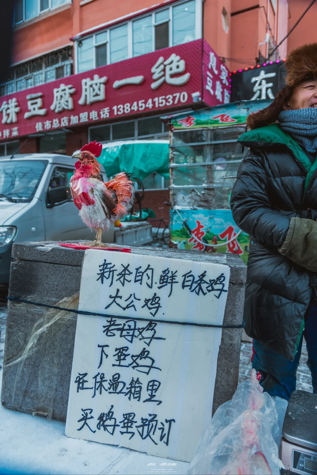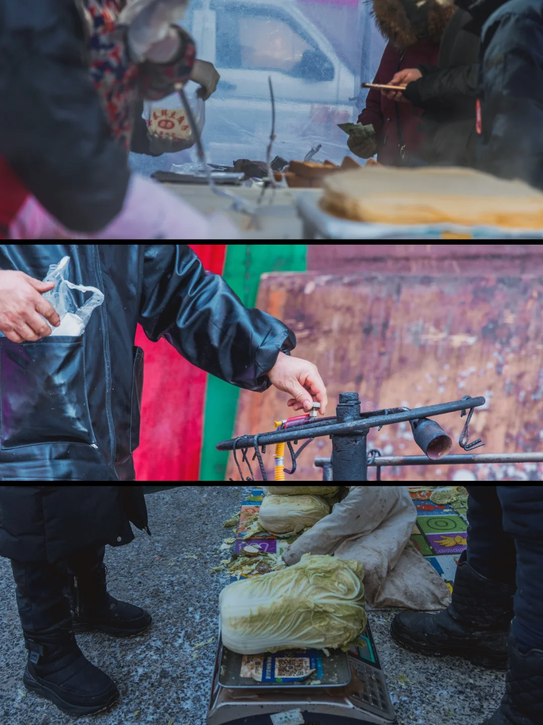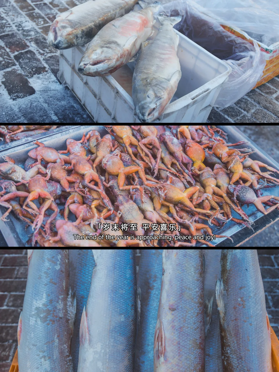 比起夏天,零下30度的近江早市不再人头攒动,放眼望去,一切事物都被冻得邦邦硬,除了最常见的冻梨冻柿子,冻油条,冻鱼,冻鸡,冻白菜也刷新了我对冷冻食物的认知