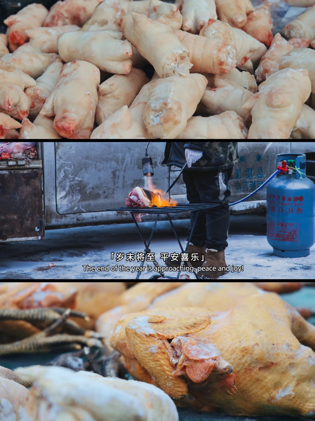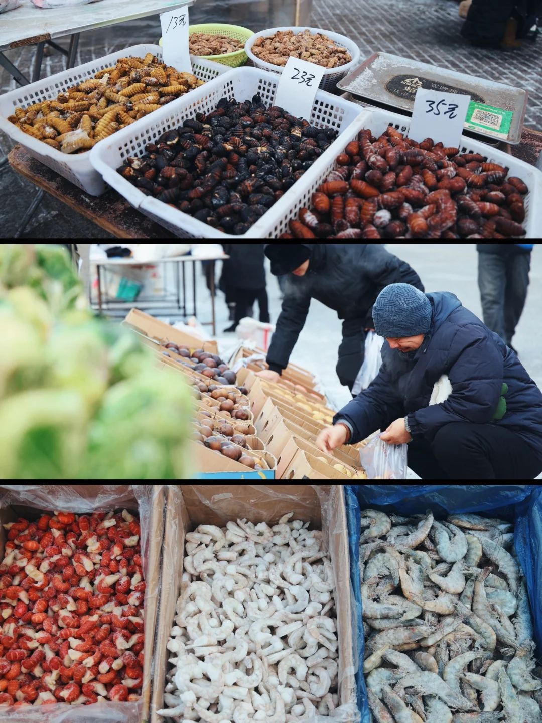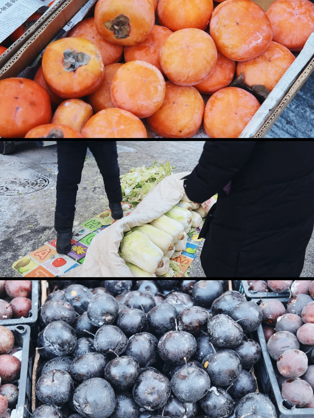 比起夏天,零下30度的近江早市不再人头攒动,放眼望去,一切事物都被冻得邦邦硬,除了最常见的冻梨冻柿子,冻油条,冻鱼,冻鸡,冻白菜也刷新了我对冷冻食物的认知