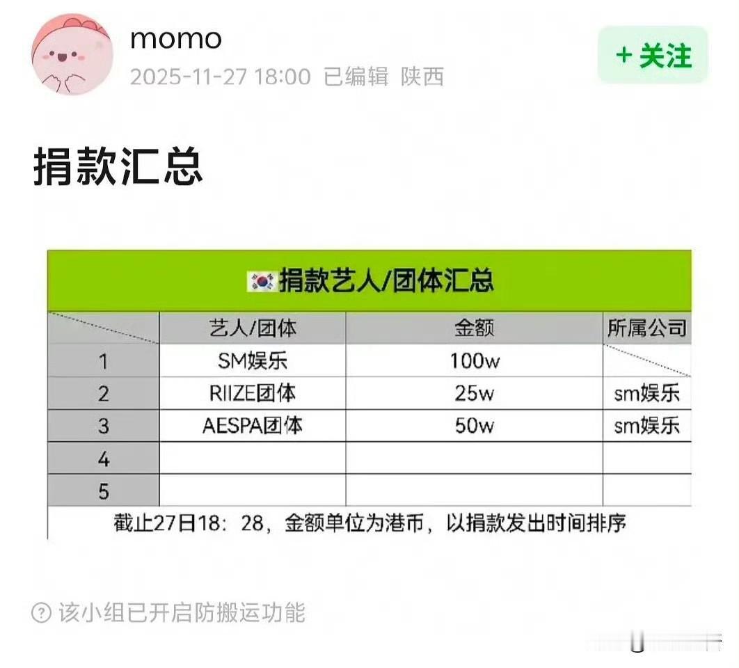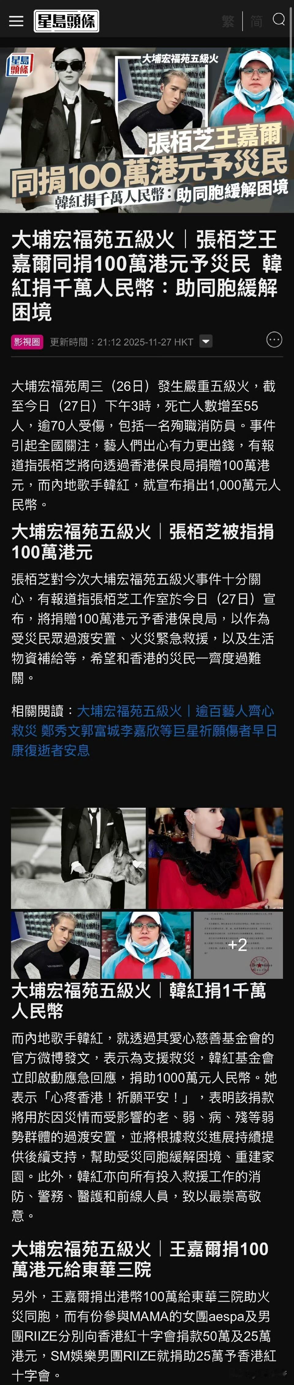 后续!继周深、张柏芝捐款后,又一明星,默默的捐款了,太低调了。 周深:100万港元 张柏芝:100万港元 韩国SM:100万港元 Aespa团体:50万港元 Rllze团体:25万港元 杨千嬅:捐出演唱会第一场收益,以及6场演唱会的周边收益,预计上百万。 韩红通过基金会,捐款1000万港元,用于居民的安置和后续工作,最让人意外的,是王嘉尔,默默捐款100万港币,这么有爱心的举动,却没有上热搜,只有港媒报道了,真的太低调了,每次捐款都有他的名单![泣不成声] 其他明星虽然没捐款,但都做出自己力所能及的事,比如杨紫琼、周润发,香港火灾发生后,MAMA仍将按原计划于11月28日-29日在香港举行,两人确认不会出席。 杨幂等内地艺人,也延迟官宣等活动,一起给香港同胞们祈福。