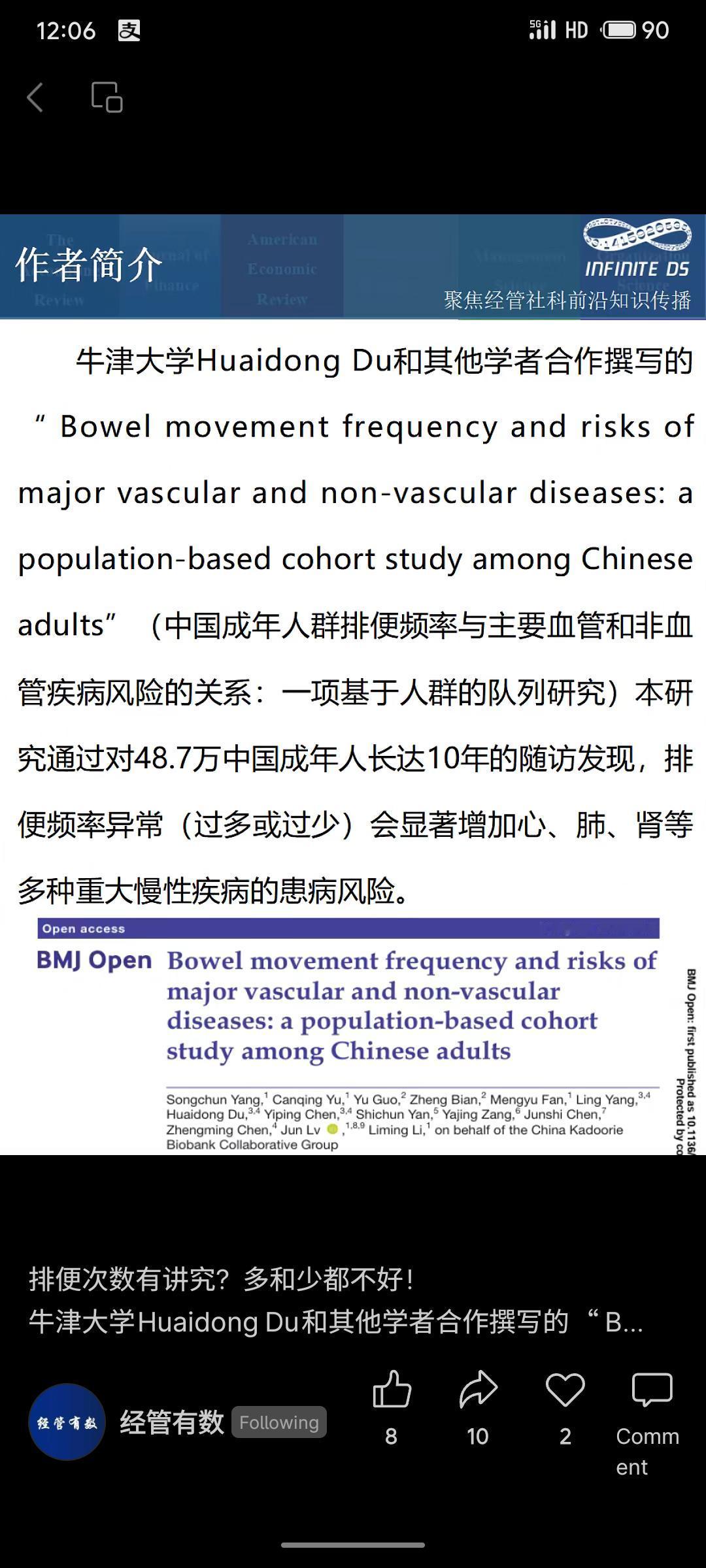 牛津大学一项针对48.7万中国成年人、长达10年的研究发现,排便频率异常与多种慢