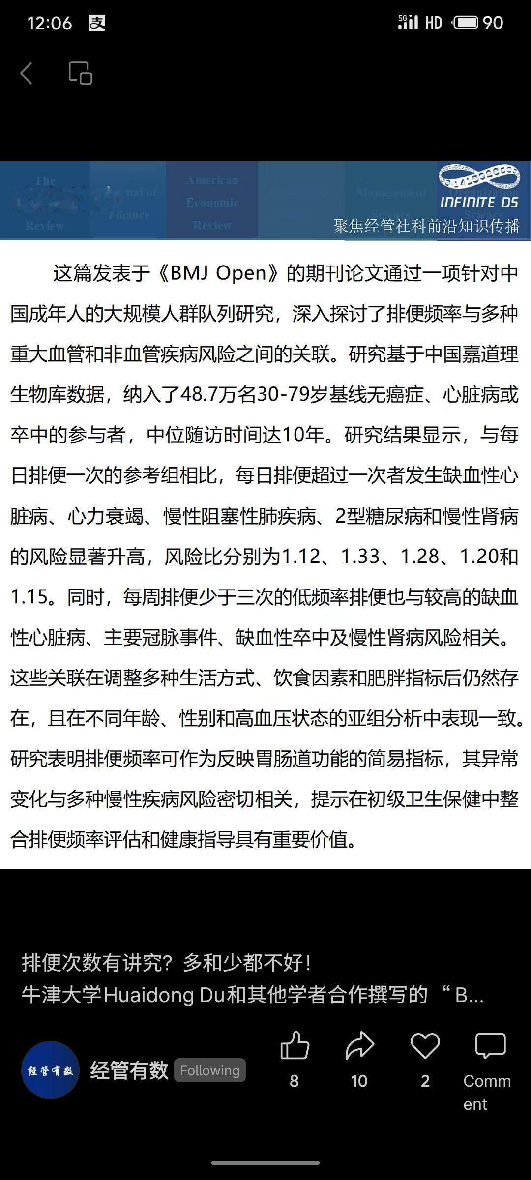 牛津大学一项针对48.7万中国成年人、长达10年的研究发现,排便频率异常与多种慢性病风险显著相关。相比每日排便1次者,每日超过1次者心衰、慢阻肺等风险升高12%-33%;每周少于3次者则与心脏病、卒中风险增加有关。研究表明,排便频率是反映健康状况的重要简易指标。