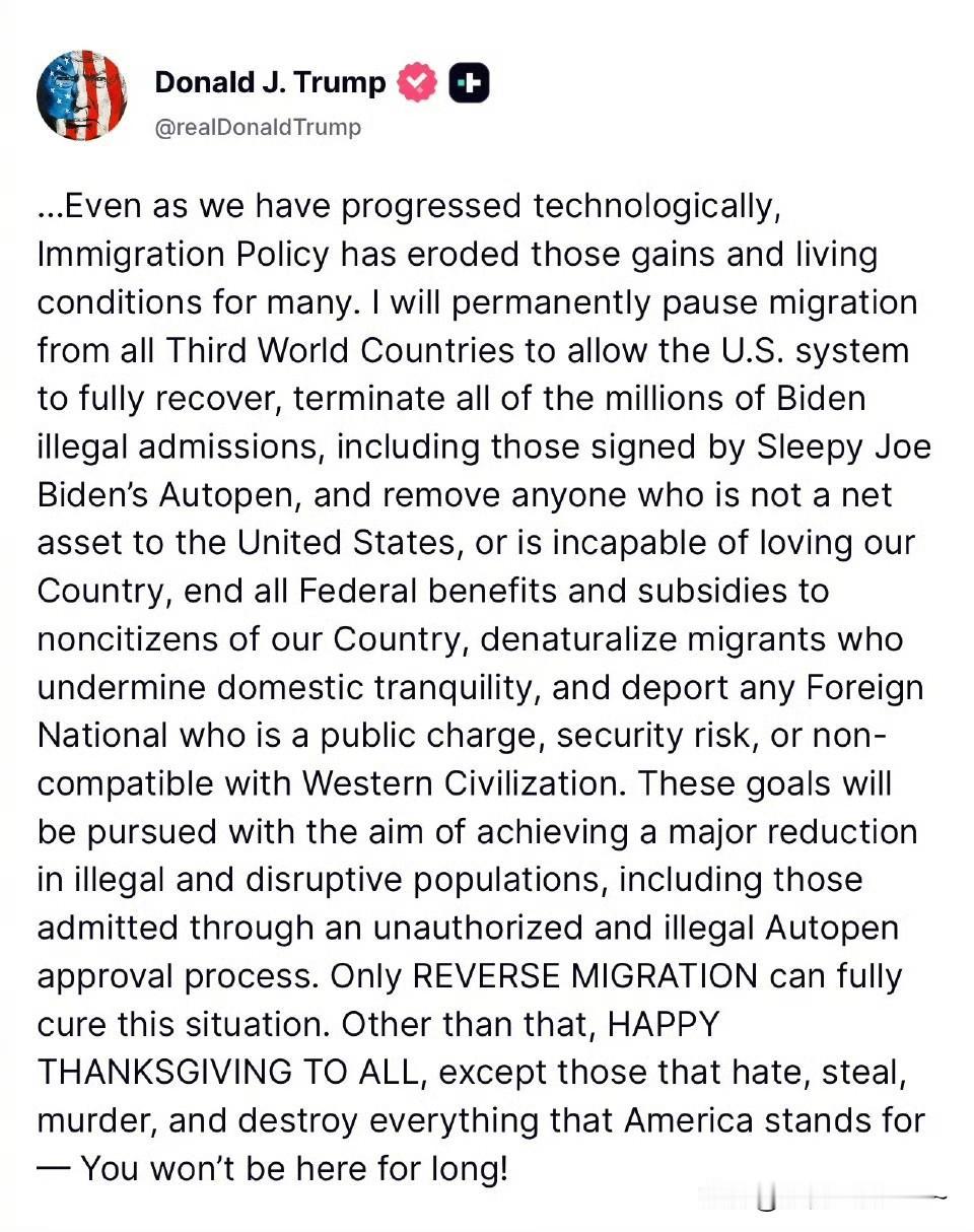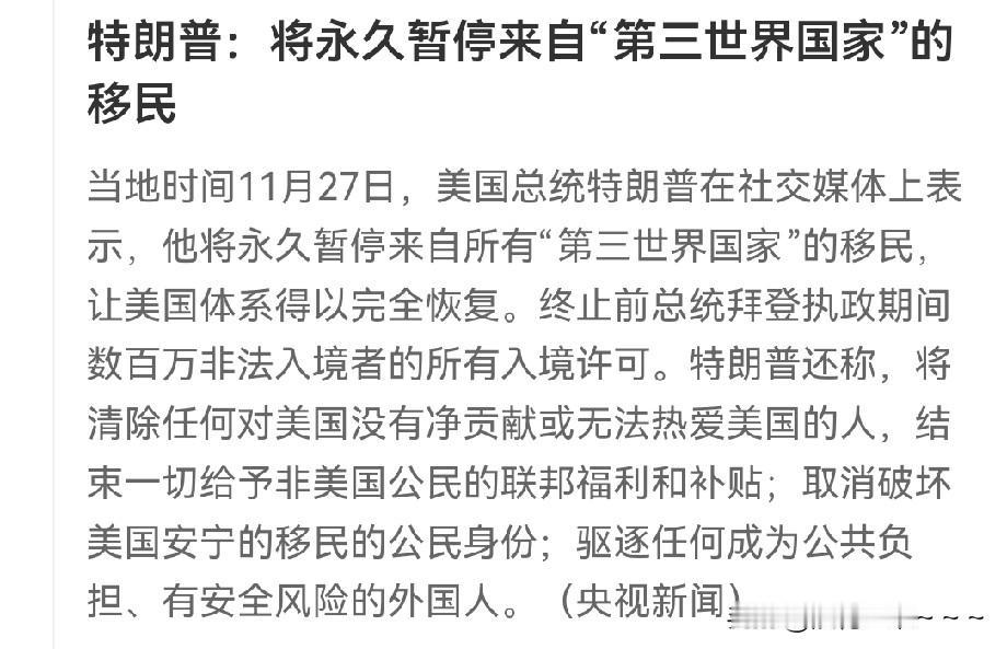 我去!下狠招了?[笑哭] 特朗普:将永久暂停来自“第三世界国家”的移民。 唉,怎么说呢?有点狠啊。因为特朗普这个划分的范围有点广,要知道“第三世界国家”也就是所说的“发展中国家”或者是“全球南方”加起来🈶100多个呢?咱就说一个国家吧,你让印度怎么办?印度这么多人口,他们有很多人想到美国去啊!特朗普大门一关,搞个“一刀切”政策,把全球这么多想移民美国的拒之门外,有点过头了吧?[捂脸] 话说回来,突然下这么大狠心,不知道是不是跟这两天白宫国民警卫队成员被暗杀有关。能不能执行下去,让我们拭目以待,因为民主党可能不高兴。