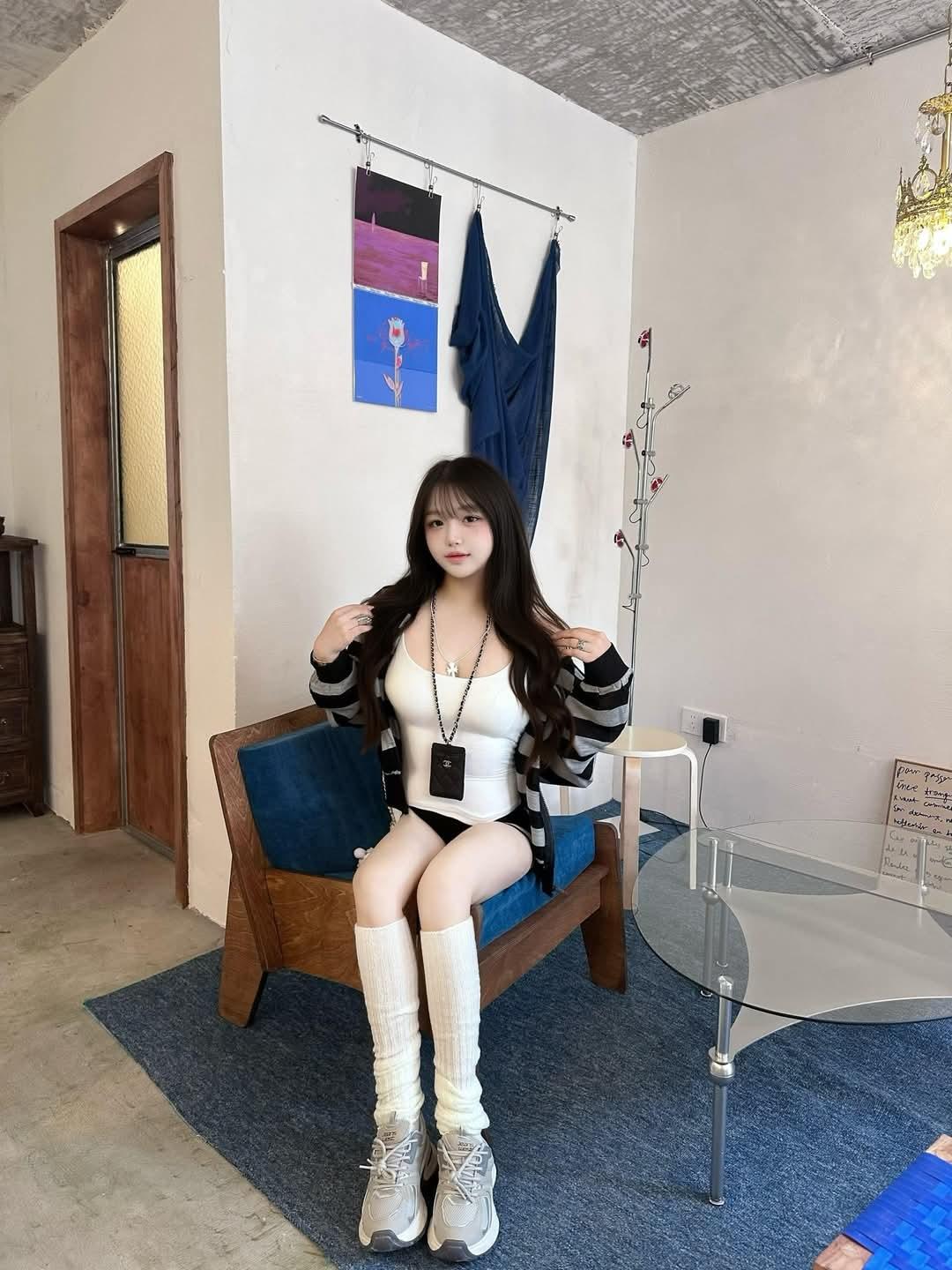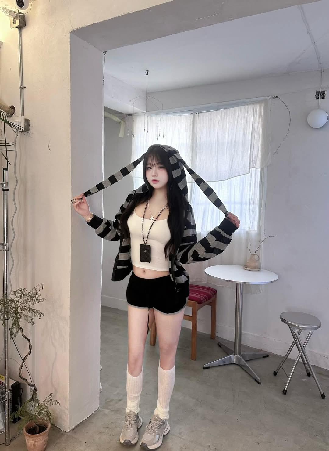 条纹衫裹着房间的松弛,白袜坠着软乎乎的甜。指尖碰过帽绳的轻,连空气都浸着不紧不慢的日常——今天是把慵懒和俏皮都揣进生活里的时刻。
