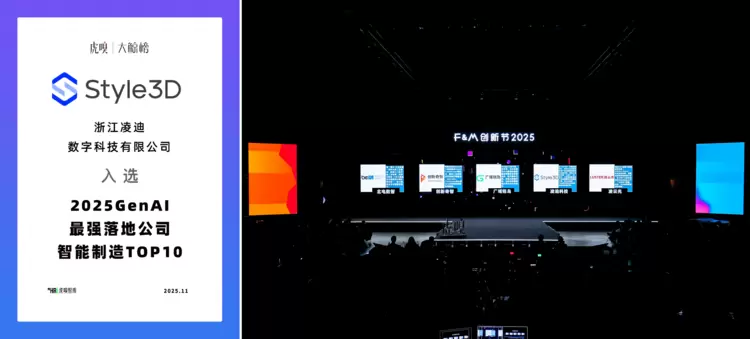 今年,凌迪科技Style3D创始人兼CEO刘郴受邀参加2025年虎嗅F&M创新节,作为第四章“AI如何重构千行百业与公司组织”开场。刘郴以主题为“如何用AI的‘意’与3D的‘骨’,解构时尚产业”进行演讲,分享了Style3D如何通过AI的创意生成与3D的结构仿真,推动时尚产业实现从灵感到成衣的智能化重构——让AI不仅能“想”出服装的样子,更能“造”出可生产的款式。同时,基于在行业内的广泛应用及创新实力,Style3D荣获“2025GenAI最强落地公司—智能制造TOP10”奖项。