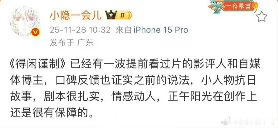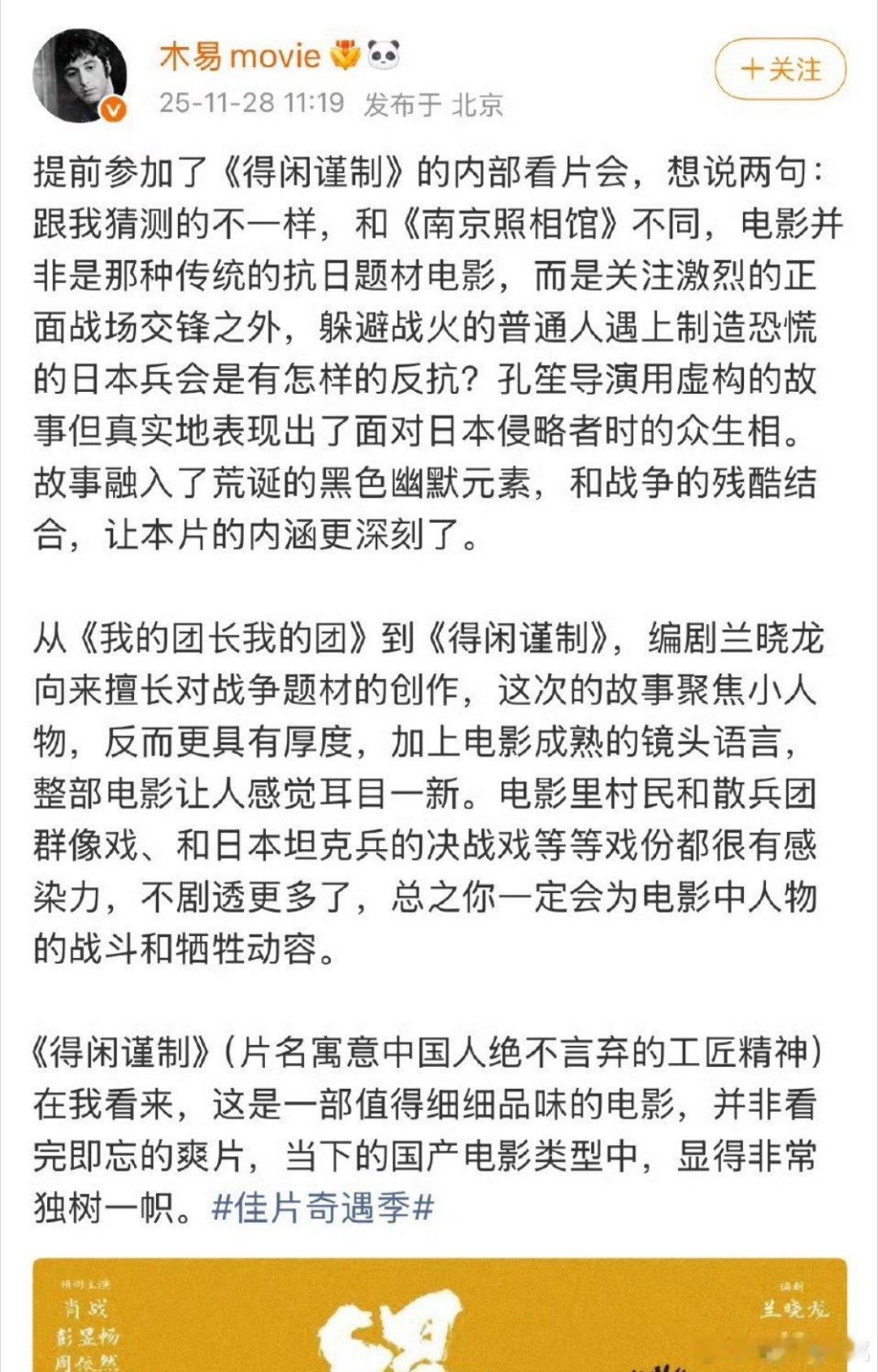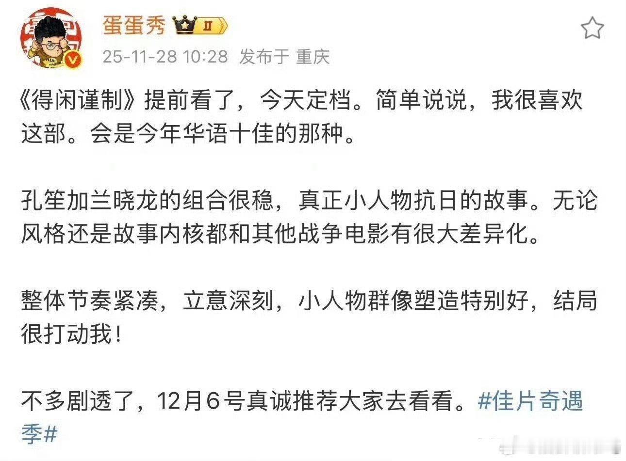 得闲谨制提前看片反馈浅看一下反馈都不错,小人物切入