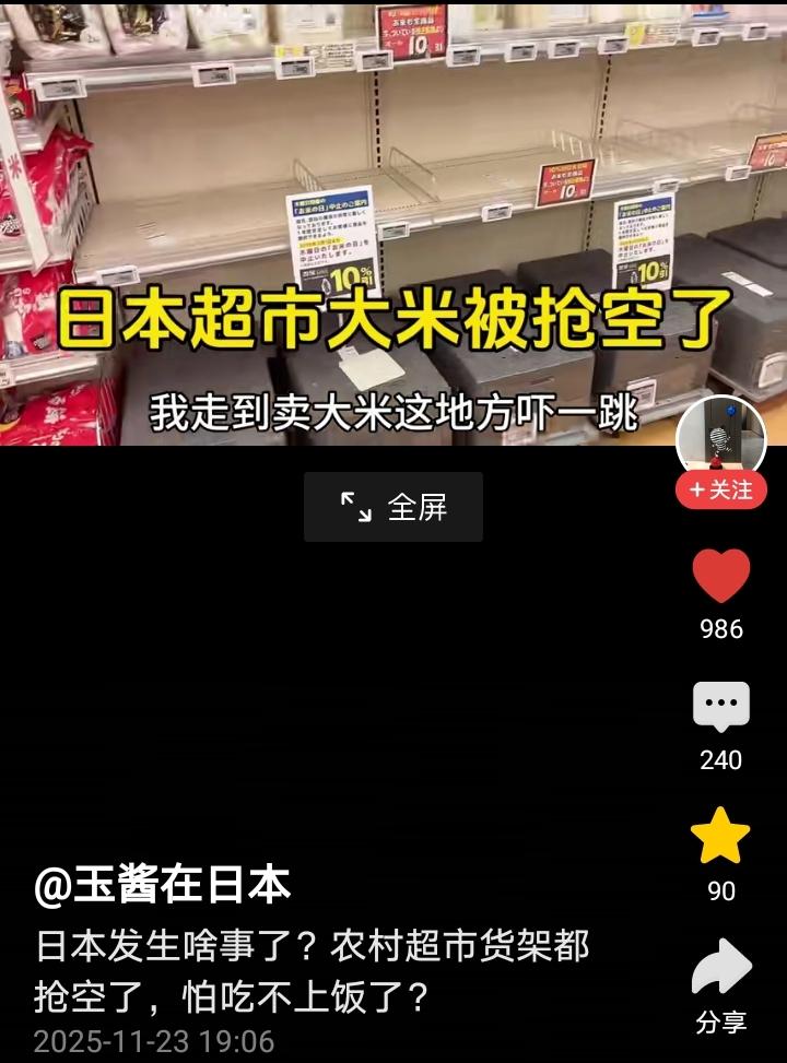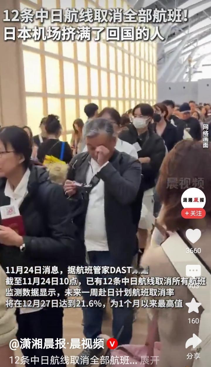 现在那些还想去本子家旅游的人,该听劝了吧!今天12条中日航线取消所有航班,机场挤满回国的人。(图一、图二) 另有在日家庭主妇发视频宣称,昨天去超市购物,发现超市大米都被抢空了。(图三) 甚至有博主发视频自称:“回国机票已买好,并取出了所有的工资,马上回家,再也不来了。”(图四) 视频中看到好多人在愤怒,有人举着膏药旗在叽里呱啦乱叫,又有报道说支持者和反对者开始对峙了。 总之,种种迹象表明现在本子家里气氛很微妙,社会情绪可能快到某种临界点了。 君子不立危墙之下,同胞们还是听劝为好,安全第一别再乱跑了。
