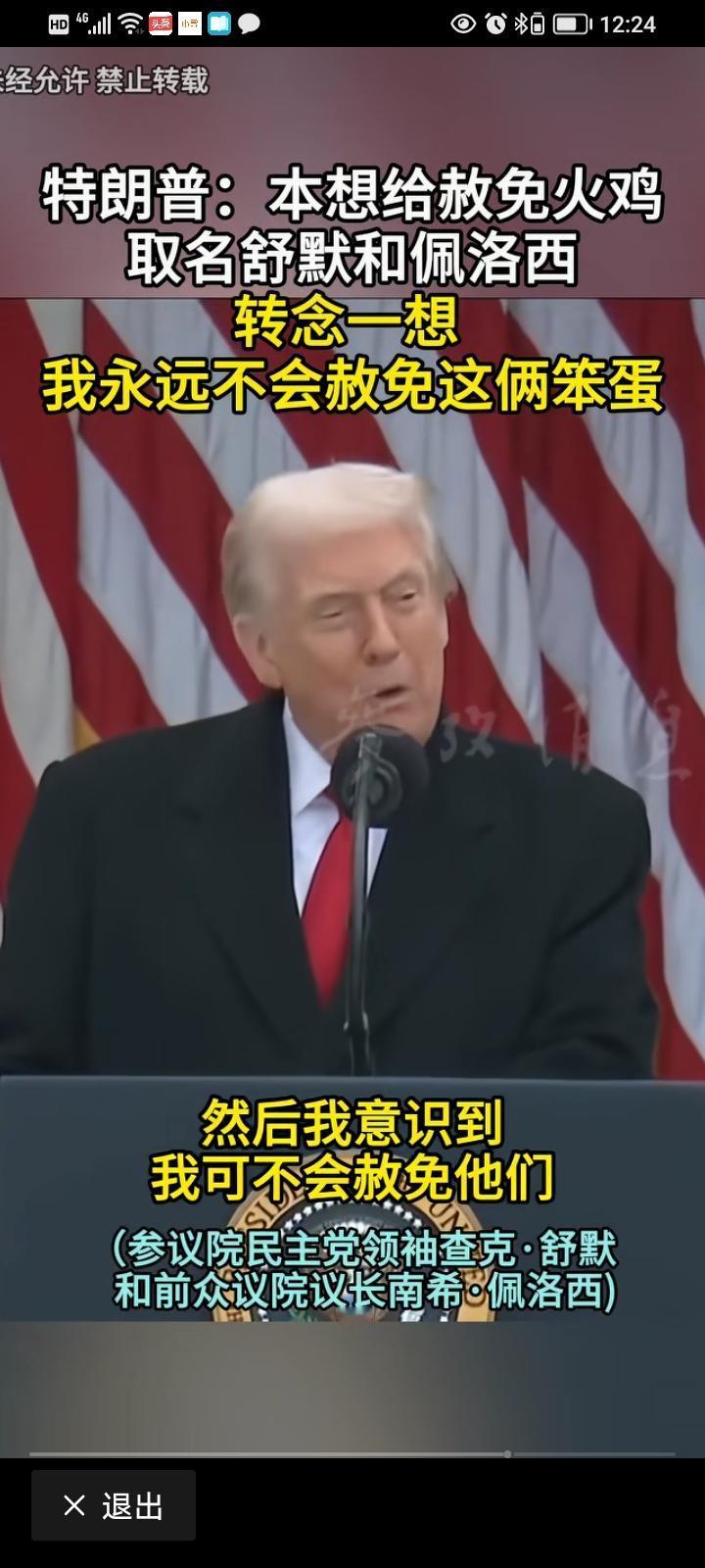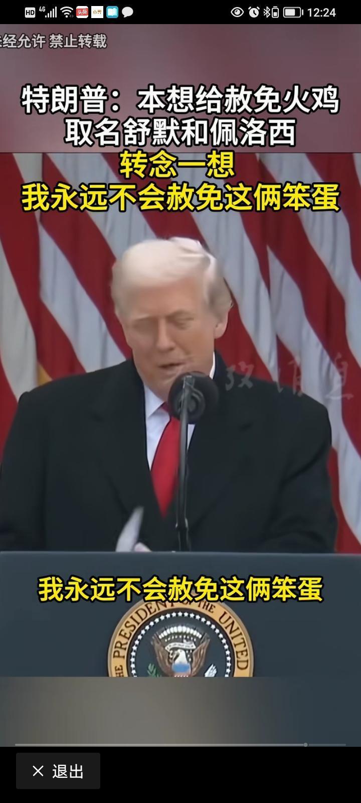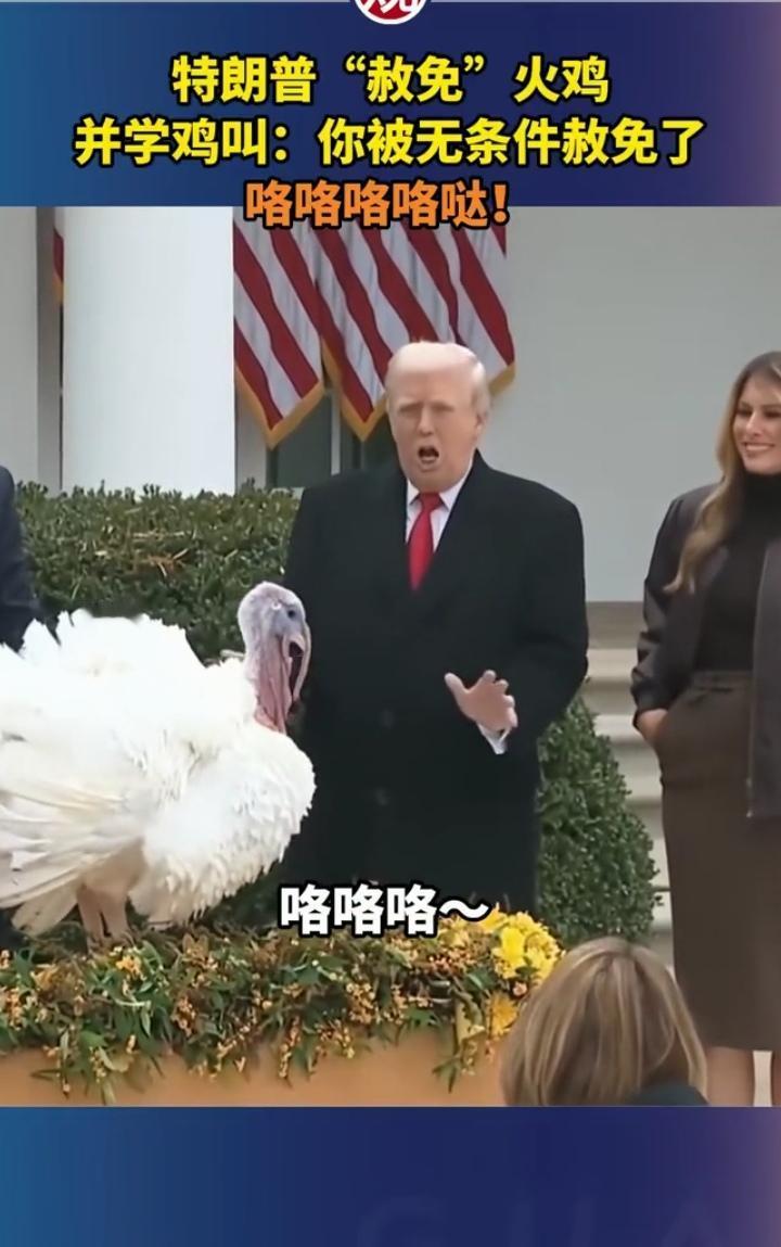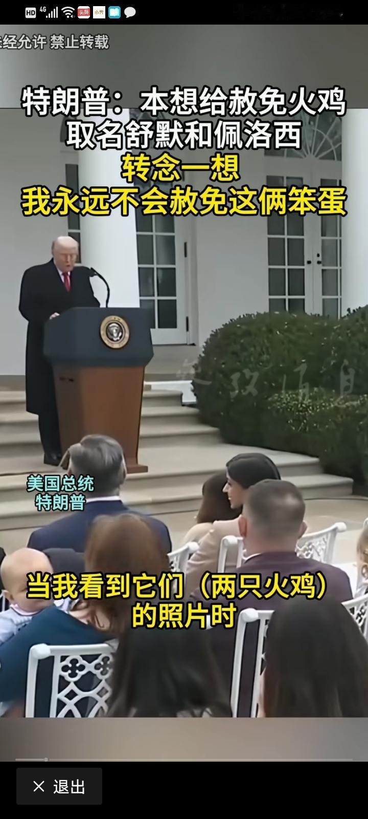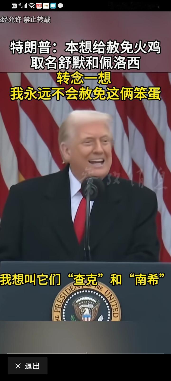 网友调侃:佩洛西要是看到特朗普赦免火鸡这段视频,估计得气的月经不调了![祝福] 我当时走在路上看到这段,也让这个老登逗的哈哈笑,路人像看傻子一样瞅着我[我想静静],太特么尴尬了! 事情是这样的,11月25日特朗普在白宫参加感恩节火鸡赦免仪式。 台下坐满观众,老特来到即将被赦免的火鸡跟前一本正经地说:“我想跟你们说一件超重要的事,从现在起你们被无条件赦免了。”[灵光一闪] 那火鸡觉得老特在给它训话,所以老特话音刚落,便咯咯咯地抗议,好像在骂:“滚滚滚,要不是你们这些道貌岸然的伪君子追杀我,我用得着你赦免吗?” 老特听不懂火鸡语,以为火鸡在感谢他,见状像小孩一样模仿火鸡表演脱口秀,表情像抽风的样子“咯咯咯”地叫🤣,逗得旁边人哈哈大笑。 然后高潮来了,这货移步到发言台对下面的媒体记者和观众说:当我看到它们(两只火鸡)的照片时,我想叫他们“查克”和“南希”(参议院民主党领袖查克.舒默和前众议院议长南希.佩洛西),但我很快意识到,我可不会赦免他们,我永远不会赦免这俩笨蛋! 顿时,台下那帮人被老特逗得笑成一团。 太逗了,老特赦免火鸡,受伤的是佩洛西! 佩洛西遇见老特算是倒了八辈子霉了,老特不高兴时拿她损几句,高兴了也损几句,但凡想起来都要损几句。更搞笑的是,这事竟上了热搜,佩洛西大概率也看到了。就是不知道佩老婆子下次见到老特,会不会给他挠一个大花脸呢?![笑哭]