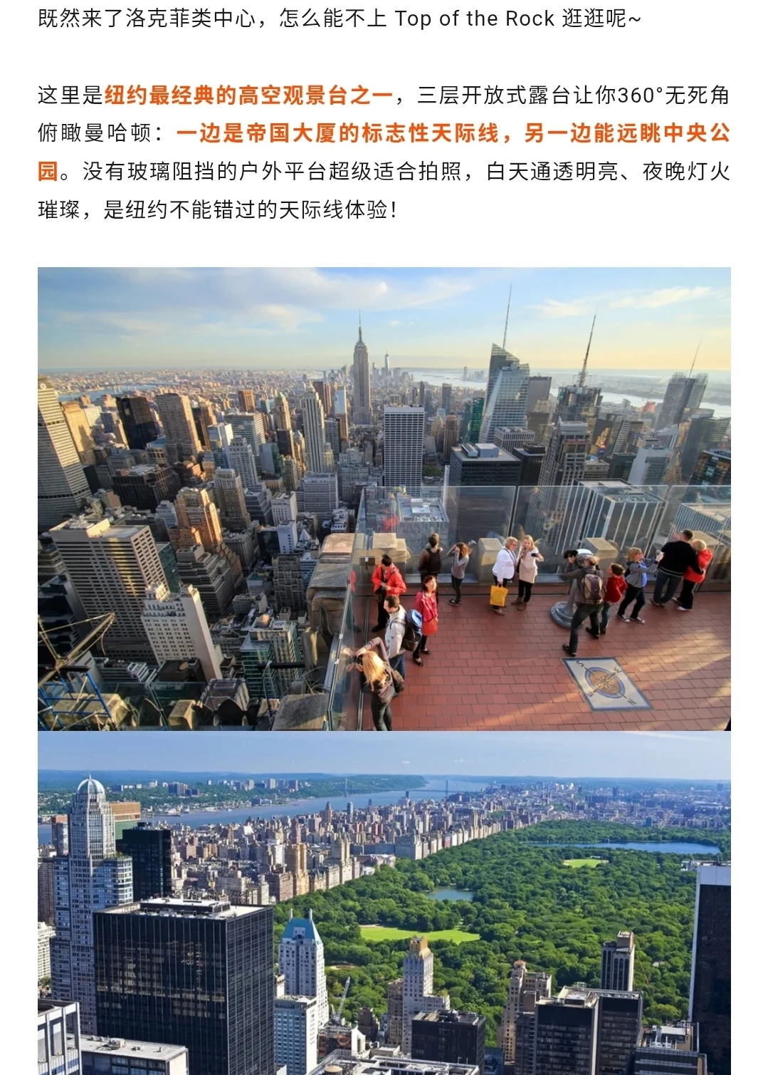 🔥既然来了洛克菲勒中心,怎么能不上 Top of the Rock 逛逛呢~这里是纽约经典的高空观景台之一,三层开放式露台让你360°无死角俯瞰曼哈顿
