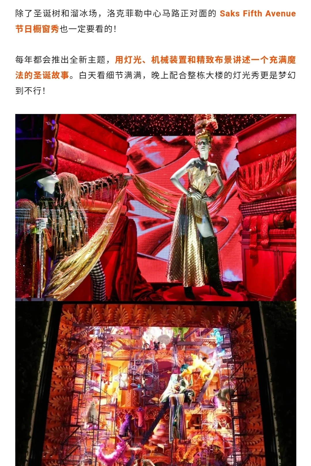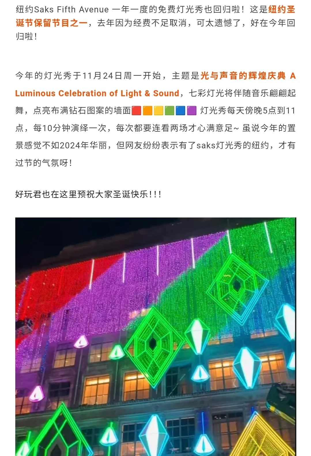 🔥马路对面的 Saks Fifth Avenue 橱窗也超级美,梦幻的节日灯光秀今年也回归了!灯光将伴随音乐翩翩起舞,点亮布满钻石图案的墙面,每天傍晚5点到11点,每10分钟演绎一次
