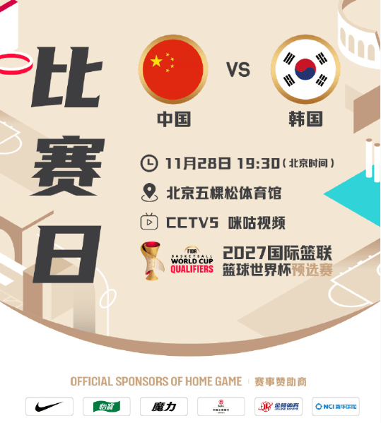 原文如下:“今晚19:30,北京五棵松体育馆,2027年男篮世界杯亚洲区预选赛中国男篮主场迎战韩国男篮!全场一心,为中国队加油!”