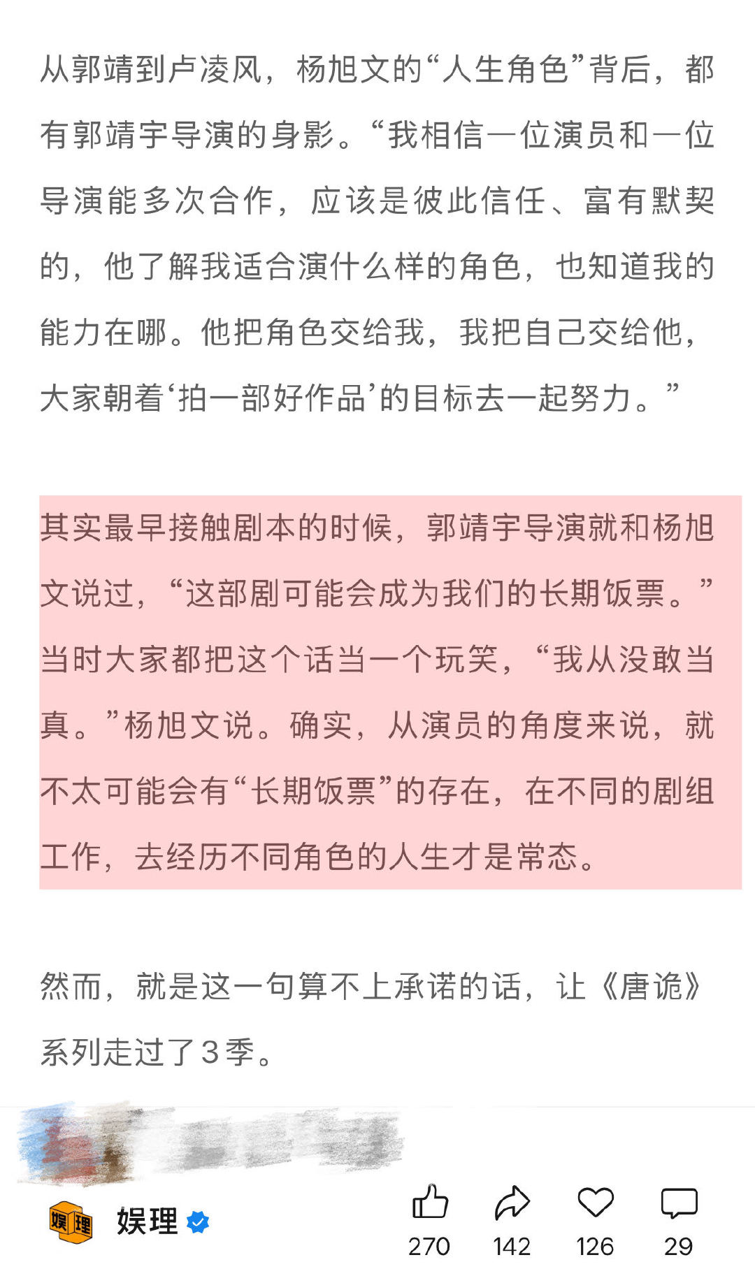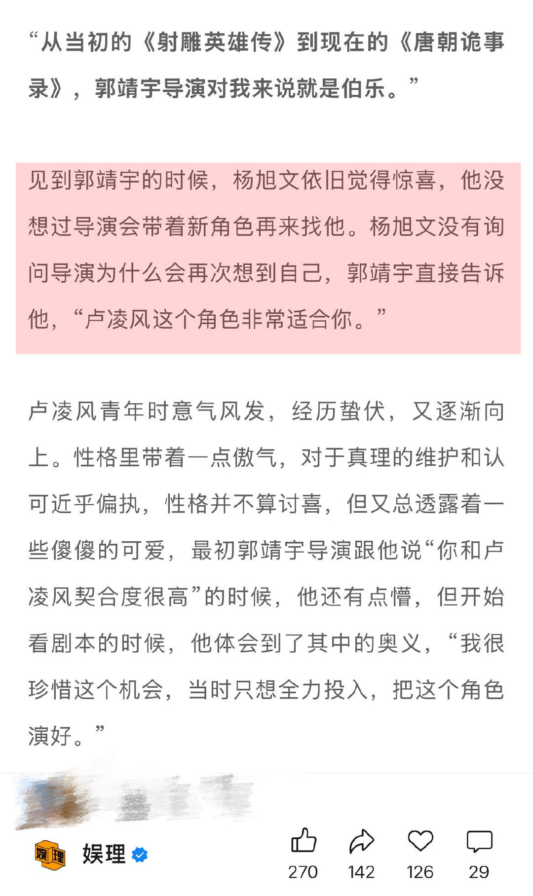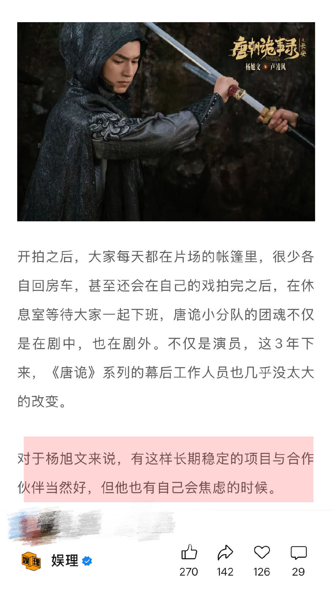 杨旭文说不是演而是成为卢凌风 杨旭文因唐诡打戏眼角受伤 据透露,三年前也有接到剧本,只是总没有合适的。就在这时,他撞上带着《唐诡》上门的郭靖宇导演。“从当初的《射雕英雄传》到现在的《唐朝诡事录》,郭靖宇导演对我来说就是伯乐。”杨旭文没有询问导演为什么会再次想到自己,郭靖宇直接告诉他,“卢凌风这个角色非常适合你。”娱理独家↓