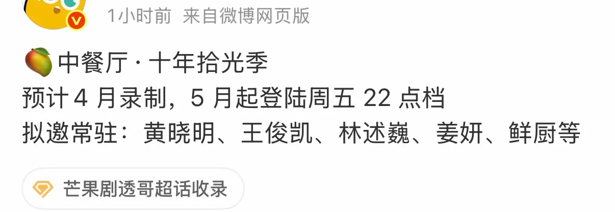 据悉,《中餐厅·十年拾光季》定位为十周年纪念季,预计4月启动录制,5月起登陆周五22点档,主打情怀回归,力求复刻节目最经典的烟火气。