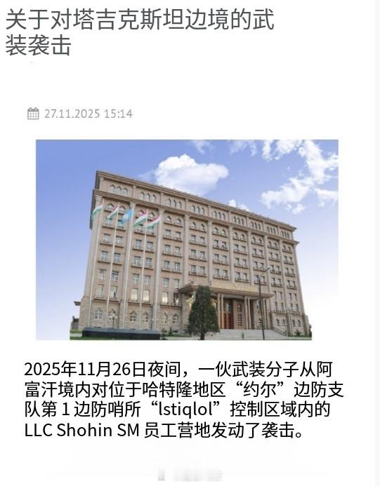 3名中国公民在塔遇袭身亡烽火问鼎计划热点现场 阿富汗这么干,算是彻底把自己与投资重建,绝缘了。11月26日晚,一伙从阿富汗境内摸到塔吉克斯坦境内的武装分子,对着边境一家挖金矿的沙欣sm公司员工营地,使用榴弹无人机和步枪发动了突然打击。十分不幸,三名中国公民被袭击身亡。这只是阿富汗恐袭分子对咱们袭击的一连串事件里的小高峰。2024年11月,也是在阿富汗和塔吉克斯坦边境,和这次是同一个区域,阿富汗不知名武装对工人发动袭击,导致咱们1人死亡,4人受伤。2025年1月,阿富汗的反政府武装“阿富汗民族动员阵线”直接冲杀了咱们一个公民以及一名塔利班情报官。这个反政府武装是标准的反塔利班武装,但也不是什么文明玩意儿,一样是暴徒。今年1月的袭击案,阿富汗动员阵线认领了。但去年11月和今年11月的金矿袭击案,没有人认领。塔利班目前也无法控制整个阿富汗,阿富汗北部和阿富汗楠格哈尔省存在大量的小反抗武装。其中最大的就是阿富汗动员阵线,其次还有三个大号是阿富汗自由阵线和民族抵抗阵线以及阿富汗联合阵线。这些小反抗武装,看着咱们与塔利班逐步建立合作,有点眼红了。但如果说,阿富汗塔利班连这些鱼虾都解决不了,那瓦罕走廊还是先别建了。把这群吃鸡野汉关在兴都库什山脉自己玩养蛊吧!