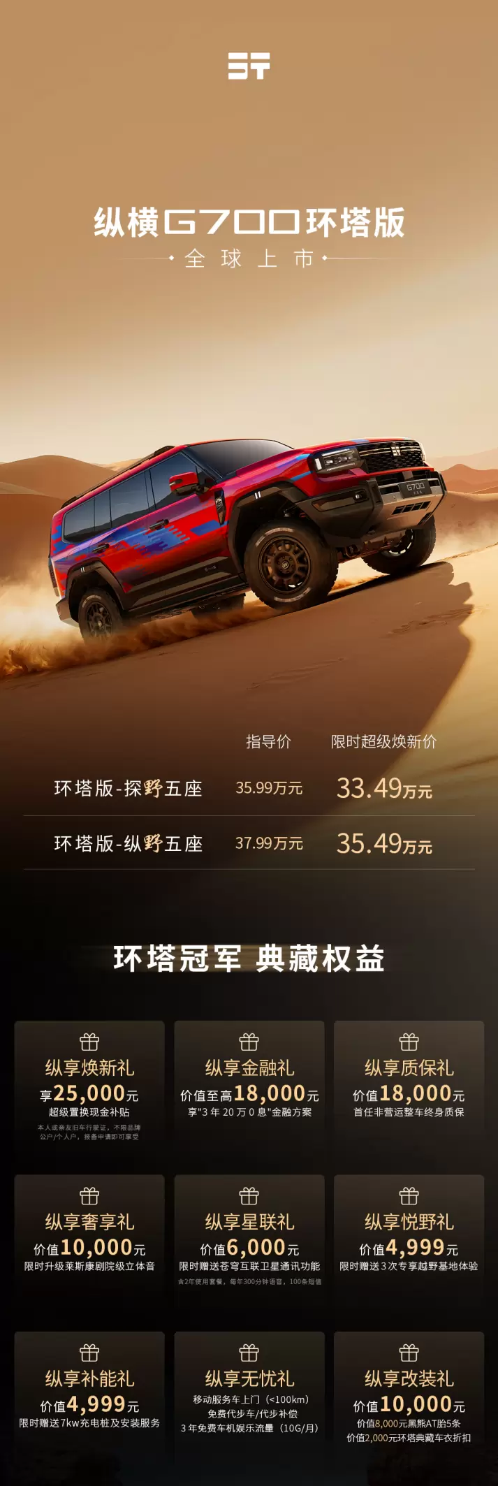 2025广州国际车展纵横G700环塔版全球首发上市堪称全场焦点,这次发布会不仅是一场全领域豪华SUV的盛宴,更是纵横以极限环境验证可靠品质,用技术冗余重塑豪华越野的硬核实力标杆。纵横G700环塔版推出2个版型,限时超级焕新价33.49万元—35.49万元,还带来九重专属好礼权益,从购车到用车、玩车全链路尊享体验,尽享从容与自由。