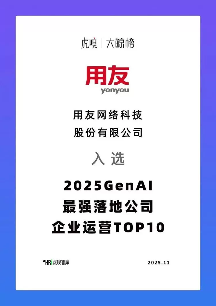 近日,2025虎嗅|大鲸榜・GenAI最强落地公司评选结果正式揭晓,用友凭借在人力资源领域的深度AI实践与卓越落地成效,成功入选企业运营板块GenAI最强落地公司TOP10。