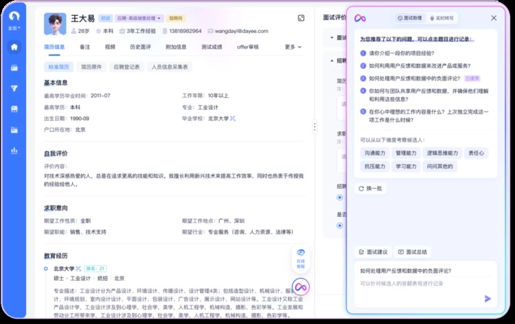 在人才招聘领域,AI已全面覆盖招聘各个环节。在简历获取阶段,AI从招聘渠道和企业自有人才库中智能推荐适配候选人,在简历筛选环节,AI能自动评分排序,辅助HR筛选;在初面环节,AI面试官独当一面,从冰山上下标准化评估候选人素质;在后续人工复面环节,AI为面试官推送针对性问题,智能生成面试评价并提供录用建议,大幅提升招聘效率与匹配精度。