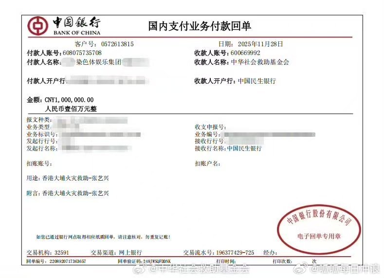 张艺兴捐赠香港100万元 张艺兴委托染色体集团为香港火灾救援捐款100万元人民币,愿香港平安!