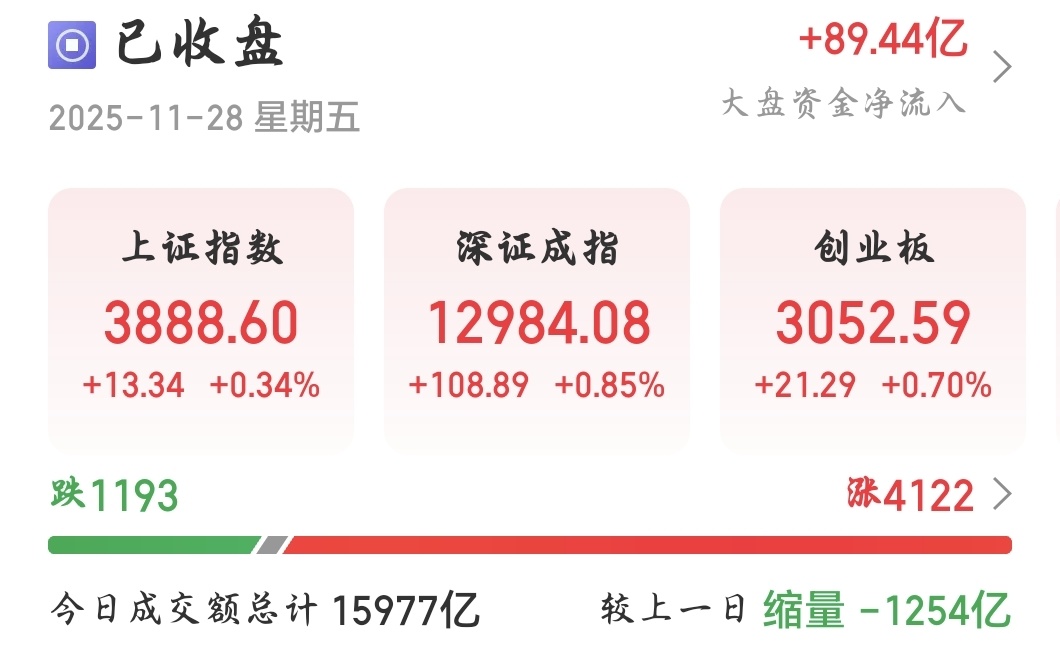 11月28日,A股迎来11月最后一个交易日,三大指数集体收涨,给全月行情画上句号。截至收盘,沪指微涨0.34%收报3888.60点,深证成指涨0.85%报12984.08点,创业板指涨0.70%站稳3050点关口,收于3052.59点。