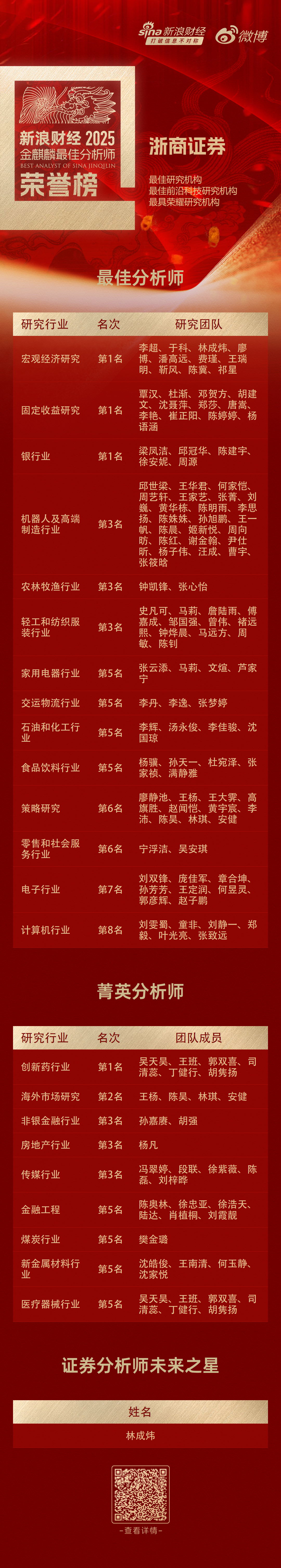 最佳分析师荣誉榜,浙商证券荣获14个领域研究大奖,3个行业荣获第一名;菁英分析师荣誉榜,浙商证券荣获9个领域研究大奖,1个行业荣获第一名;浙商证券宏观经济分析师林成炜荣获金麒麟证券分析师·未来之星殊荣。名单如下: