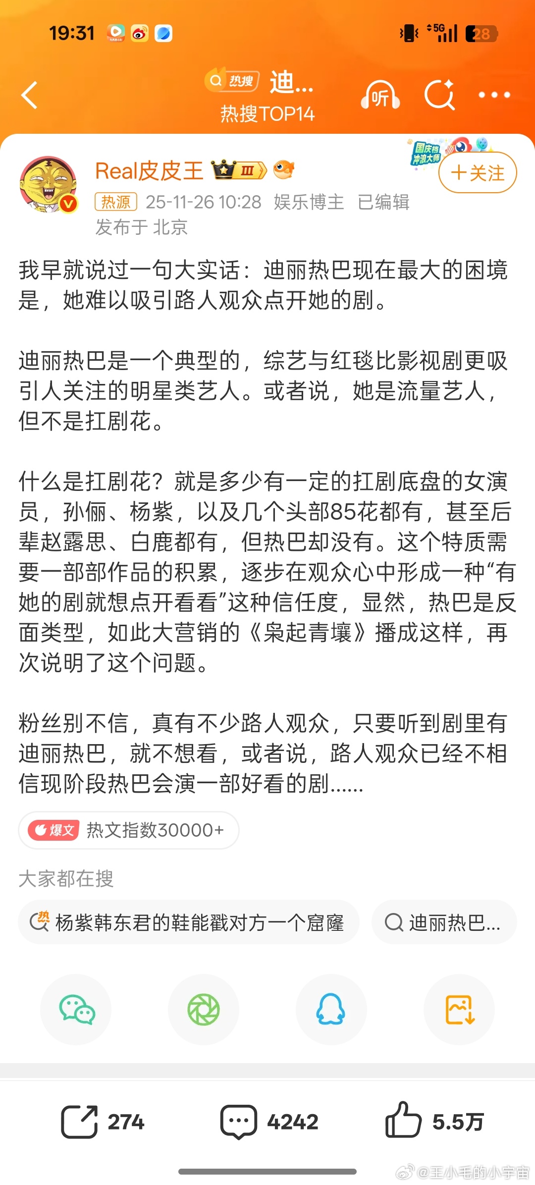 看到有网友说迪丽热巴现在最大的困境是,她难以吸引路人观众点开她的剧!就比如现在开播的《枭起青壤》,实际收视率并不是很高。如果说迪丽热巴的综艺,红毯之类的,那她就是妥妥的王炸。甚至内娱女星有一个不成文的说法,那就是走红毯不要走迪丽热巴后面,也不要一起走,不然别人的关注全在迪丽热巴身上。