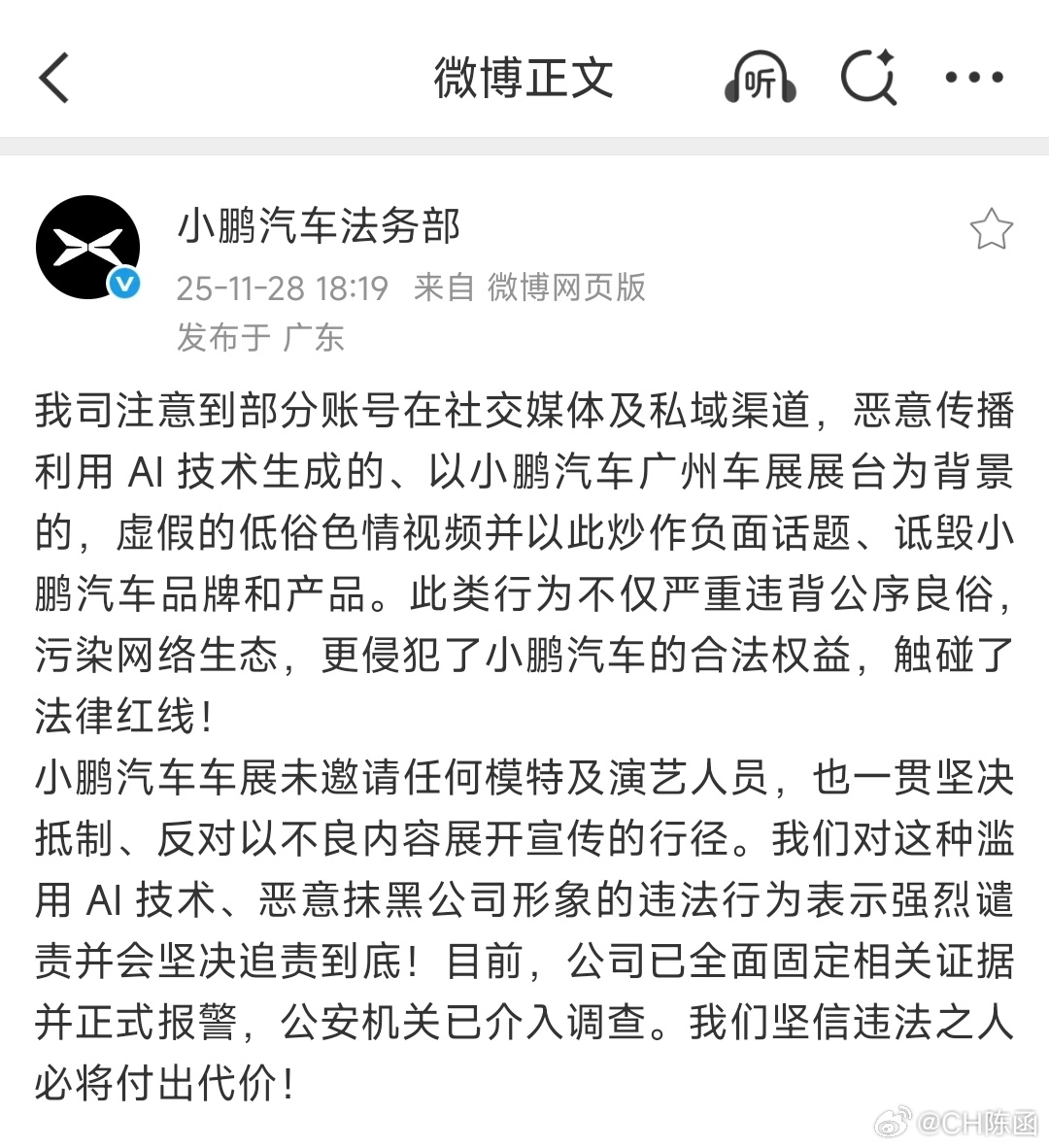 玩归玩,闹归闹,别拿品牌开玩笑刚才在群里说这可能是AI生成的,严肃追究的话可以报警。几分钟后,小鹏法务部就报警了。
