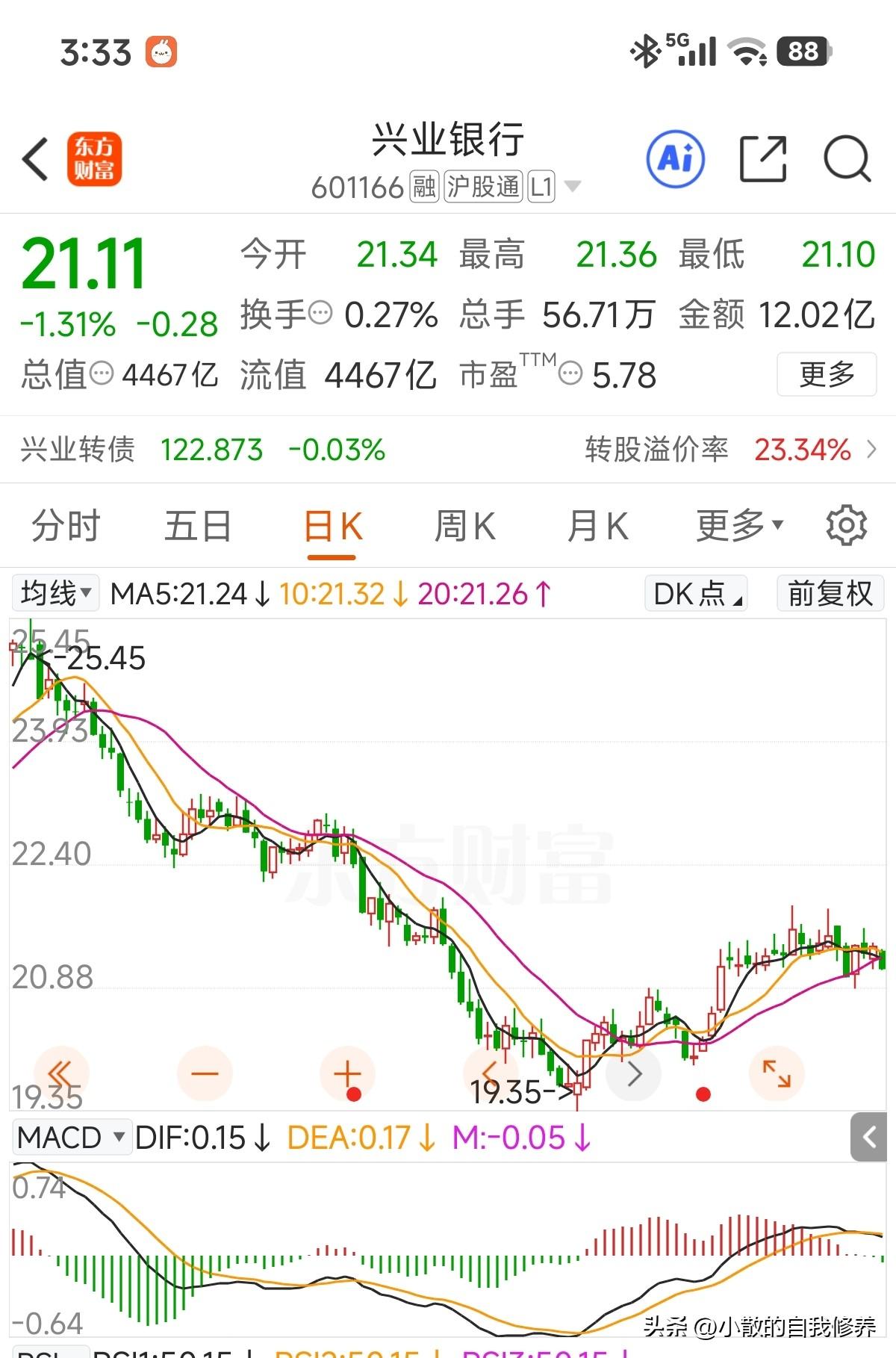单从技术面看不乐观,震荡了这么久今天一根小阴线直接破了5、10、20日均线!下方MACD也被砸绿了!但就今天这成交量指不定是虚晃一枪! 另外对于转股价以下的兴业银行,谈技术面缺点格局[捂脸]!个人仍保留了2成现金,就看主力分红除权前,能否再给到20.5甚至20以下的机会[呲牙]