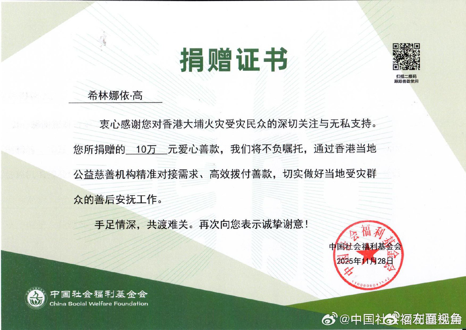 灾难面前,爱心从不缺席。为香港大埔火灾受灾群众捐款10万元,用实际行动践行责任与担当,让“守望相助 驰援香江”的信念更加坚定。向所有伸出援手的人致敬,愿同胞平安顺遂!希林娜依高驰援香港