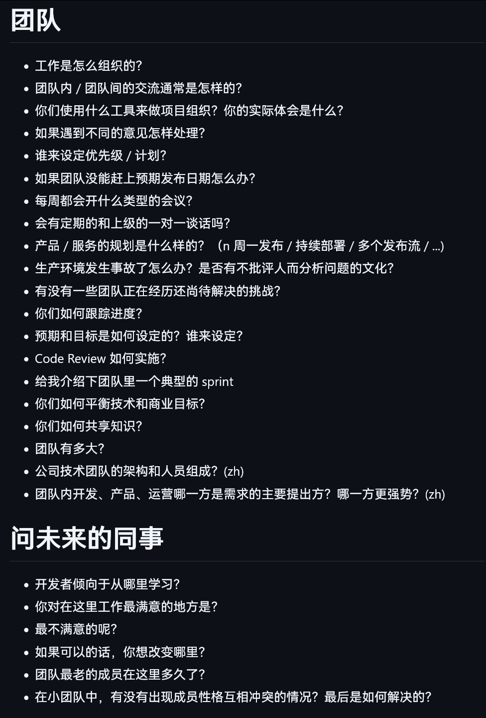 “反向面试”,技术面试最后反问面试官的话github.com/perklet/reverse-interview-zh“下面列表里的问题对于参加技术面试的人来说可能有些用。 列表里的问题并不一定适用于某个特定的职位或者工作类型,也没有排序 最开始的时候这只是我自己的问题列表,但是慢慢地添加了一些我觉得可能让我对这家公司亮红牌的问题。 我也注意到被我面试的人提问我的问题太少了,感觉他们挺浪费机会的。”图为部分内容科技先锋官