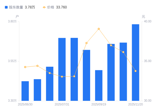 日期A股户数(户)流通A股户均持股数(股)户均持股市值(万元)2025-11-203783219182.1064.762025-11-103667119789.4071.542025-09-303658719834.8473.392025-09-193493320773.9781.182025-08-293621420034.5574.712025-08-083697219622.3864.932025-07-313696819624.5164.862025-07-183514920640.1069.142025-07-103436621110.3672.642025-06-303423421191.7672.60