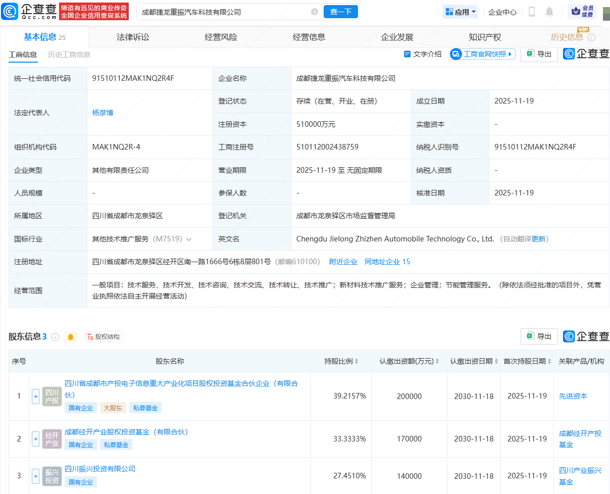 企查查APP显示,近日,成都捷龙重振汽车科技有限公司成立,法定代表人为杨彦博,注册资本为51亿元,经营范围包含:新材料技术推广服务;企业管理;节能管理服务等。企查查股权穿透显示,该公司由四川省成都市产投电子信息重大产业化项目股权投资基金合伙企业(有限合伙)、成都经开产业股权投资基金(有限合伙)等共同持股。