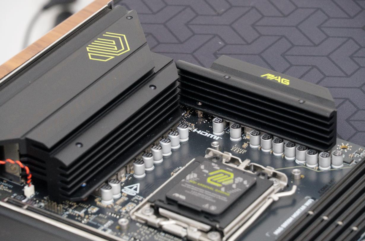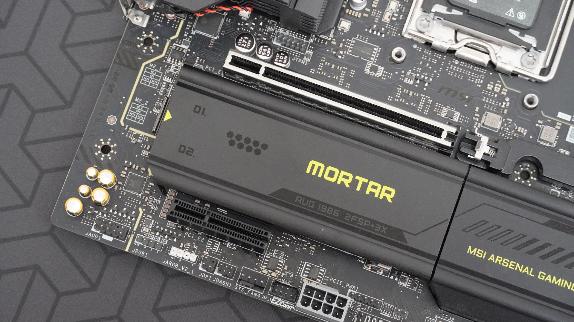 SSD 方面,微星MAG B850M MORTAR 迫击炮 WIFI正面的散热装甲下并列布置了两个PCIe 5.0x4的SSD接口,两个接口均为CPU直出,能够很好的释放PCIe 5.0 SSD的性能。SSD散热装甲为第二代免工具M.2 冰霜铠甲,且SSD同样支持免工具安装,能够大幅提升装机体验。