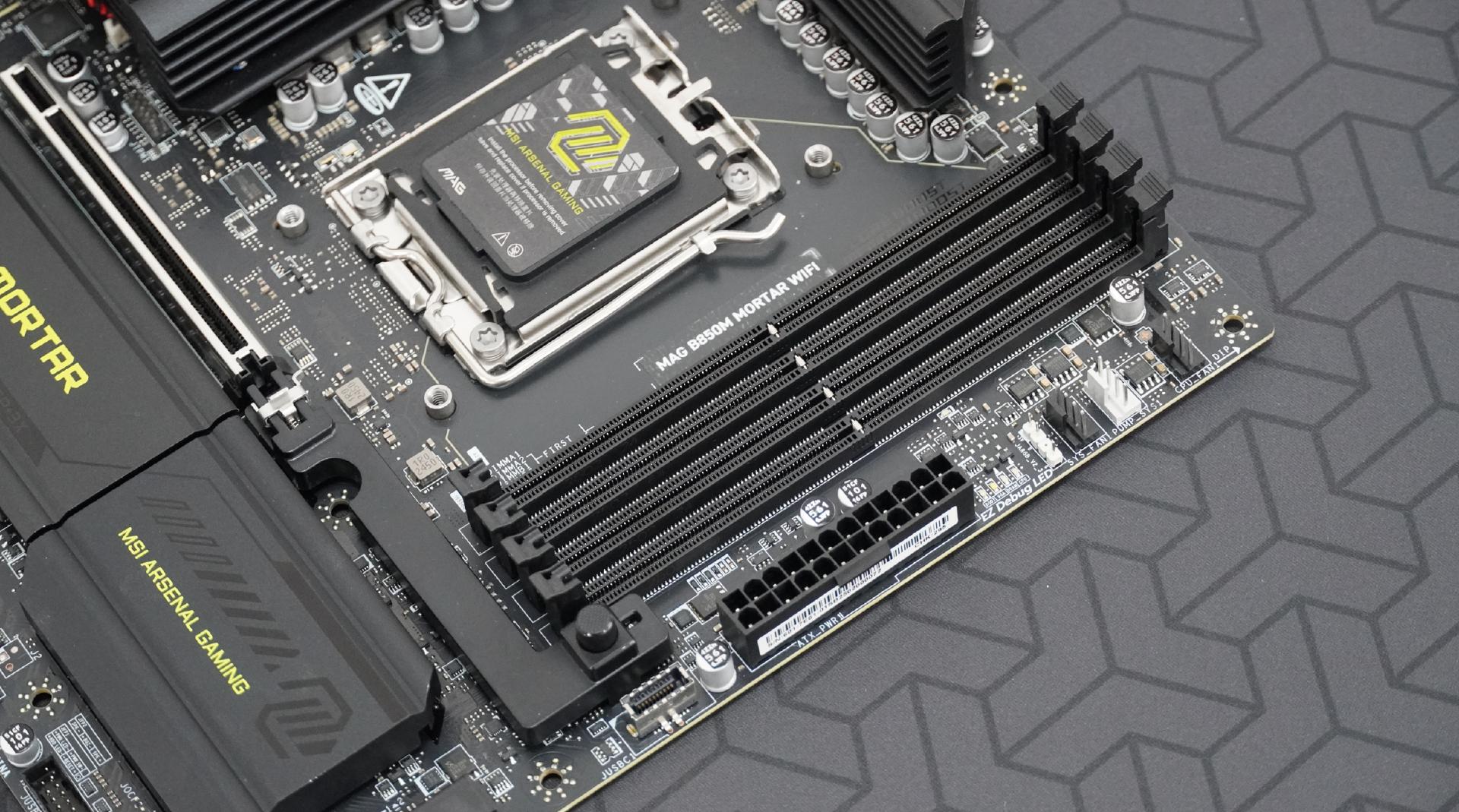 而在内存方面,微星MAG B850M MORTAR 迫击炮 WIFI采用了M-ATX主板常用的4插槽设计,不过其内存性能还是挺强的,官方声称其支持8200MT/s的高频率内存,让AMD玩家除了低时序之外,还可以选择高频率内存。