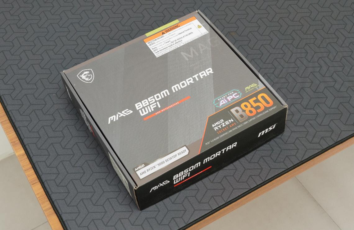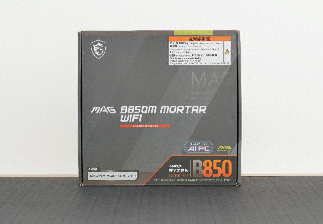MAG B850M MORTAR 迫击炮 WIFI主板在外包装上依旧采用了微星MAG迫击炮的金属灰配色,右下角用了AMD的橙红色标注了主板的芯片组的B850。