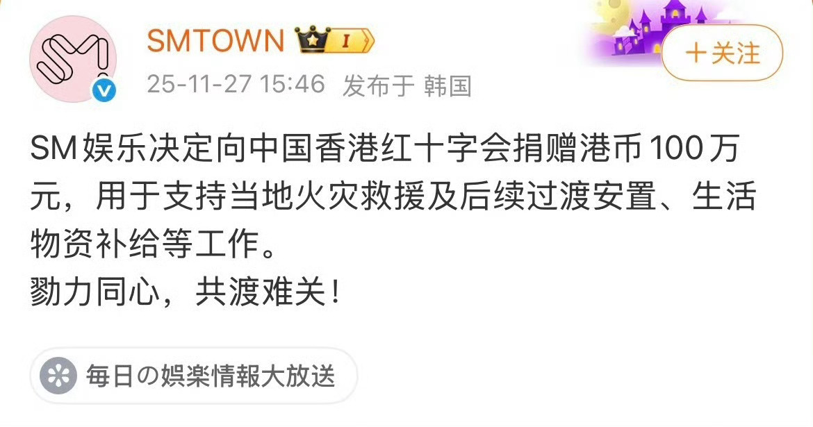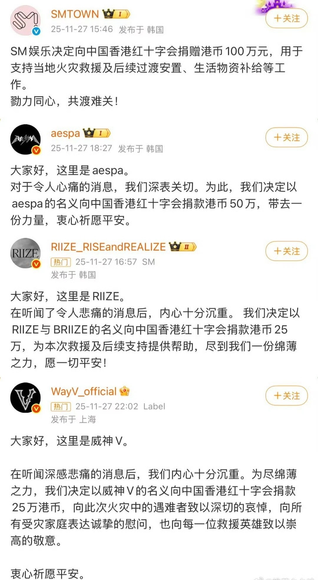 韩娱四大捐款现状韩娱几大公司陆续行动:SM及旗下团、YG各捐百万港币,HYBE捐约266万+发悼念公告,JYP暂未回应