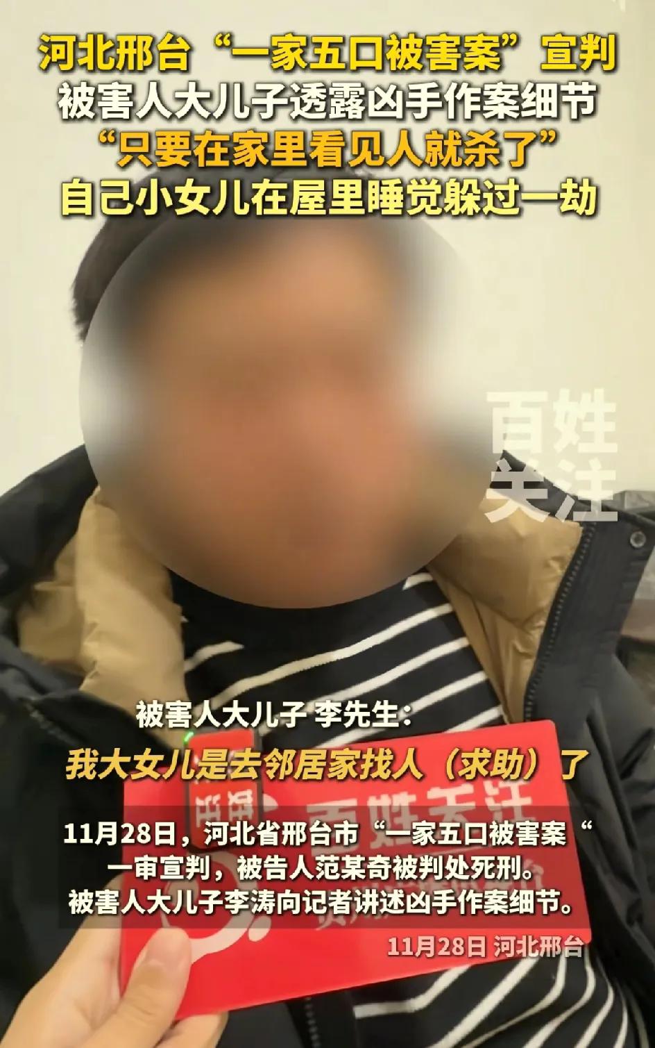 已经判了被告人范某死刑,但是受害者家属李先生和哥哥两个人并未签字。因为他们还要上诉,想要知道更多的细节。比如凶手在杀害他们一家五口之前,和自己的妻子视频通话一个多小时。然后把视频通话删除。 范某17张银行卡余额为零。把自己的钱早就转走了,不想赔一分钱。 李家人丁兴旺。两个儿子,两个孙子,两个孙女,两个儿媳,大家都住在一起,和睦相处,其乐融融。 范某家的儿子跟儿媳结婚没多久就离婚,孙女也带走了。家庭条件也不如李某家。直到今天范某认罪,却不认错,问他为何杀人,低头不语,自己都说不出来。一副死猪不怕开水烫的态度。
