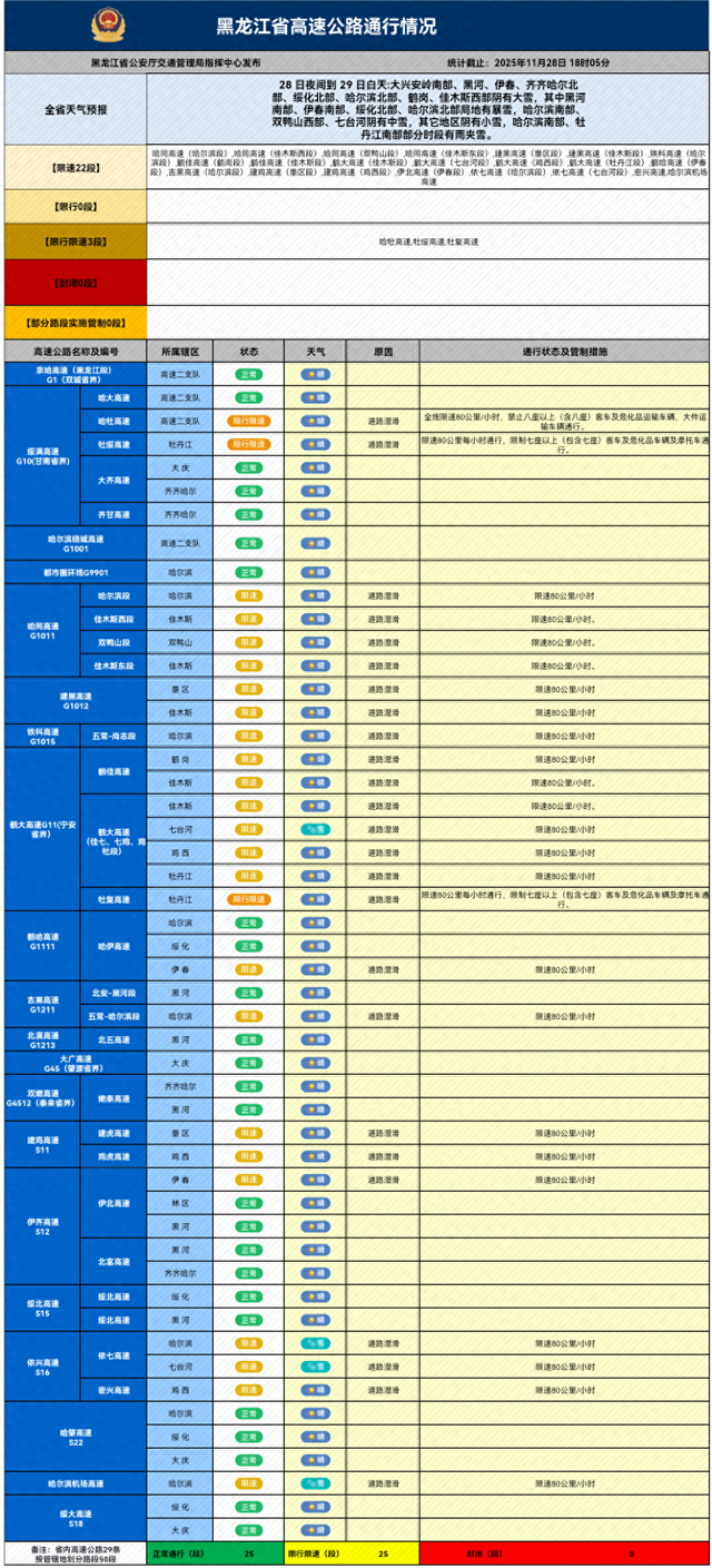 记者从黑龙江省公安厅交通管理总队高速交管部门获悉,受省内降雪影响,截至18时05分,全线封闭的高速均已解封,但仍有限行限速25段(限速22段,限行限速3段);省内其他高速路况正常。